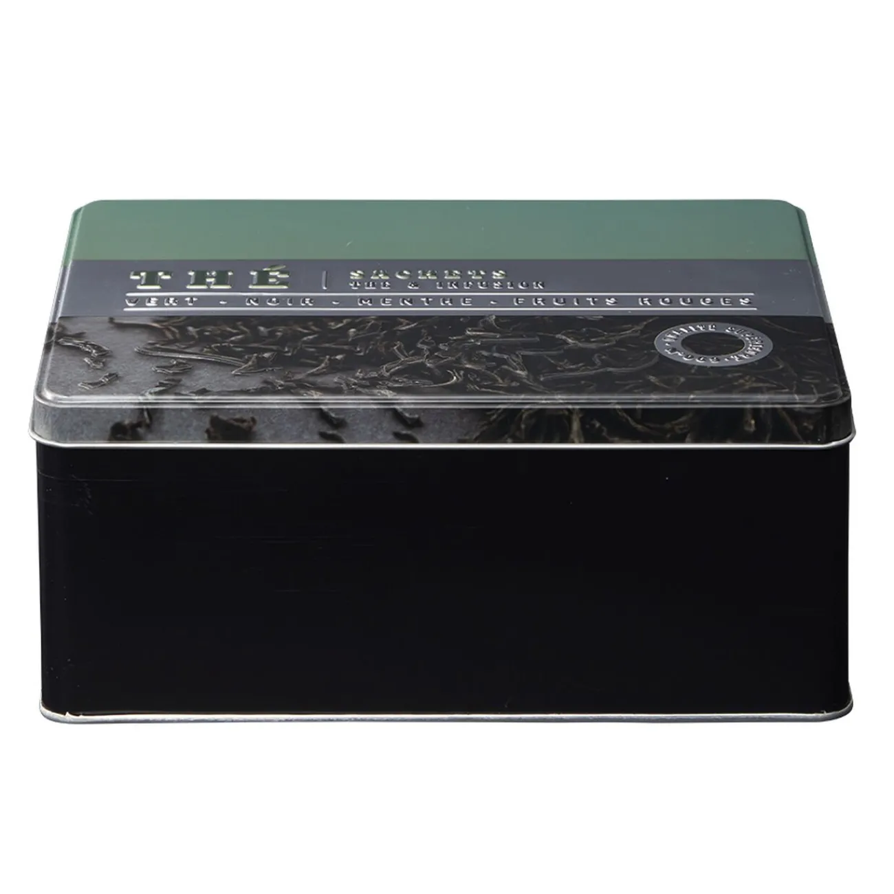 Boîte à thé rectangulaire en métal décorée d’inscriptions et d’illustrations dans les tons verts.