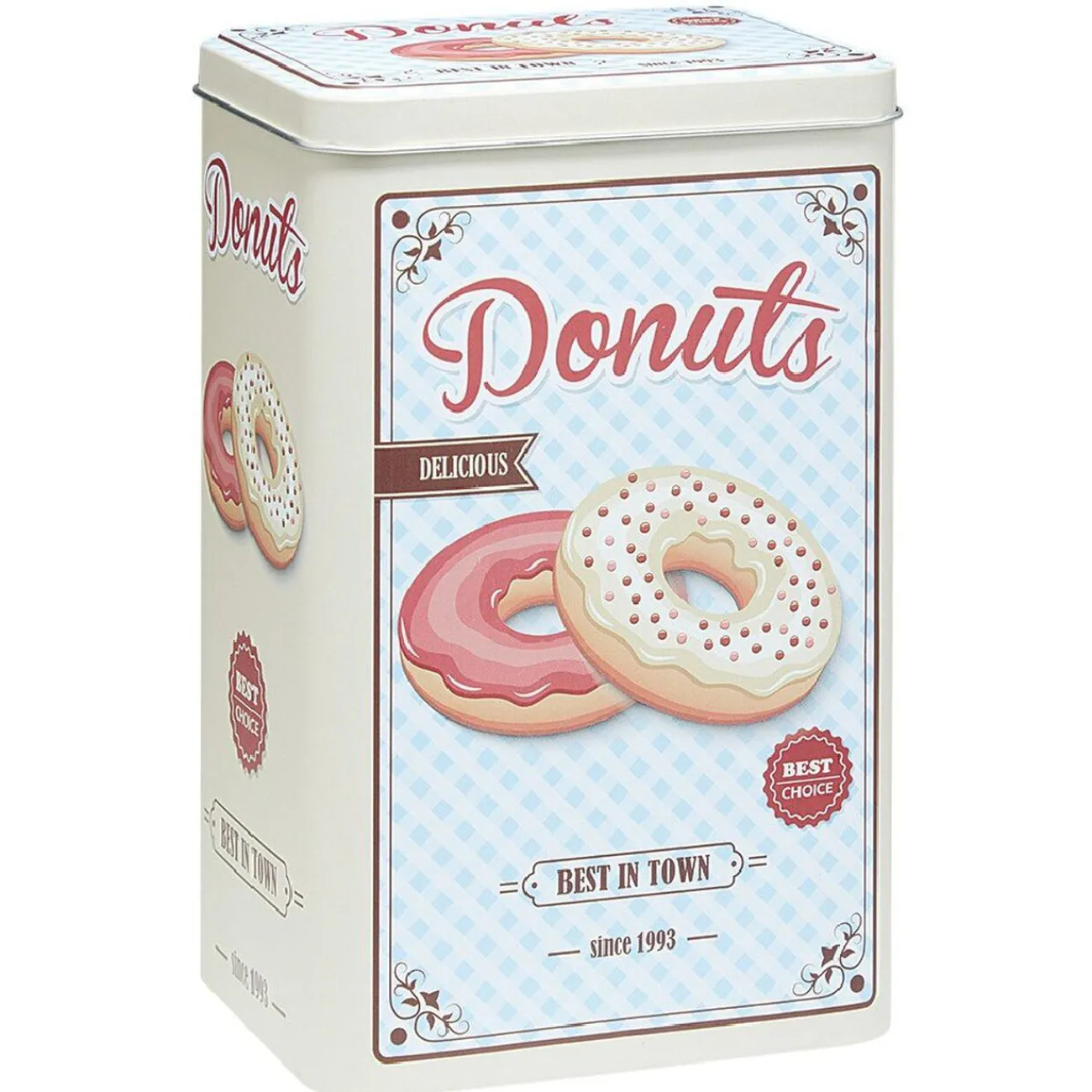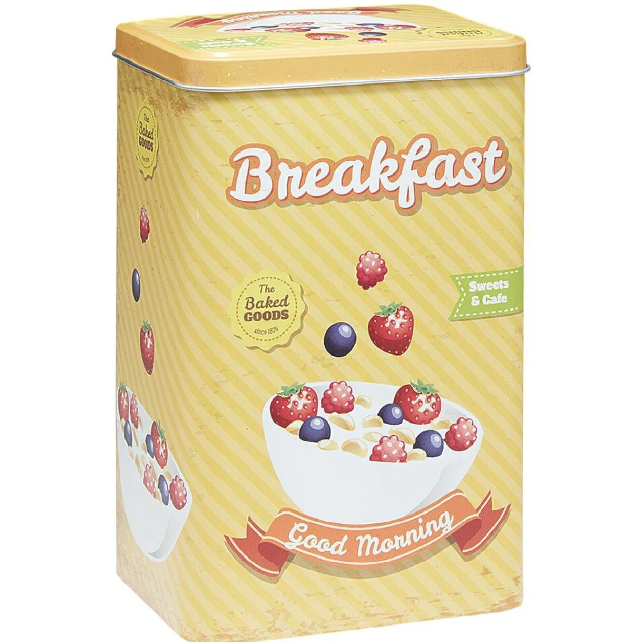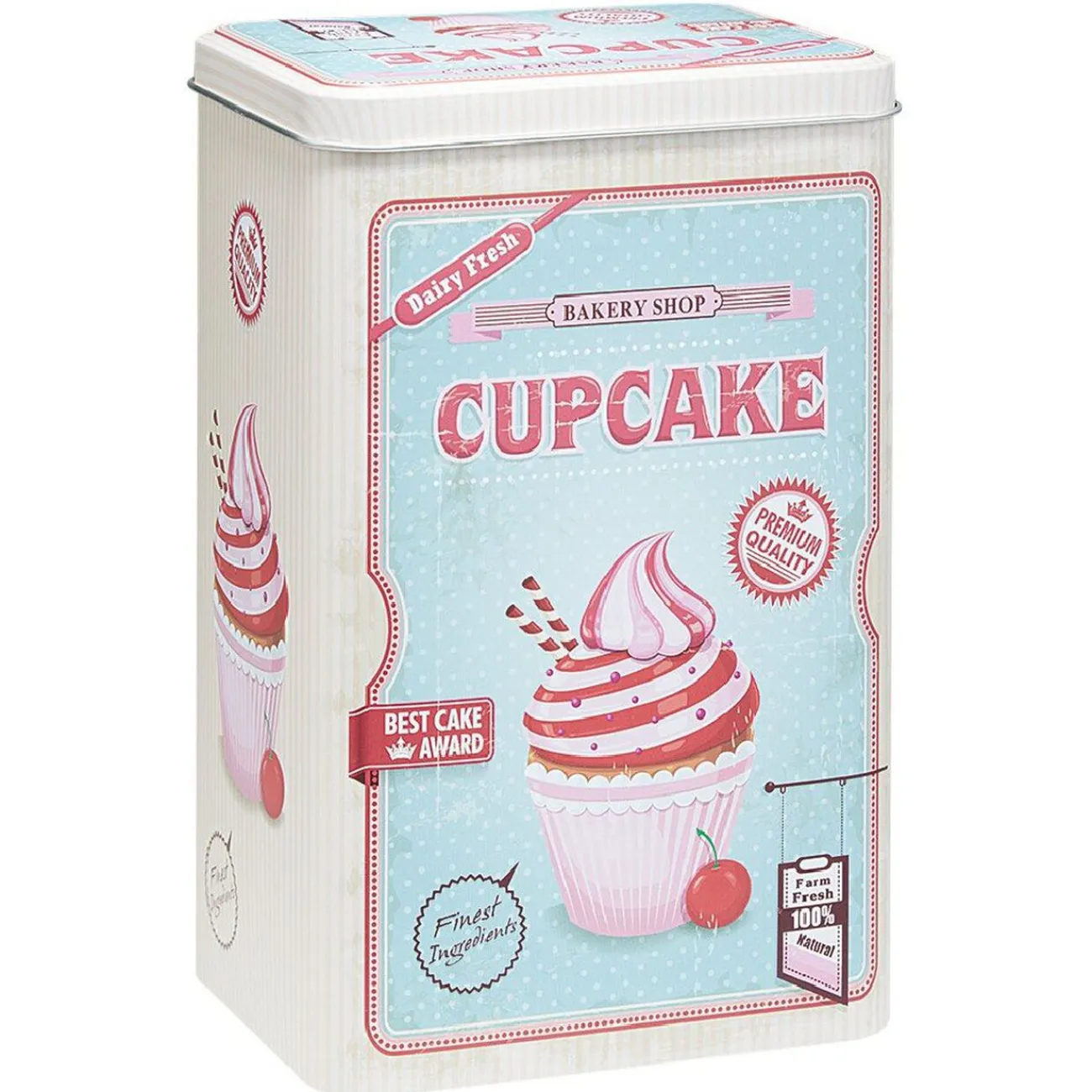 Boîte alimentaire en métal avec inscriptions et motifs sur le thème de la cuisine.