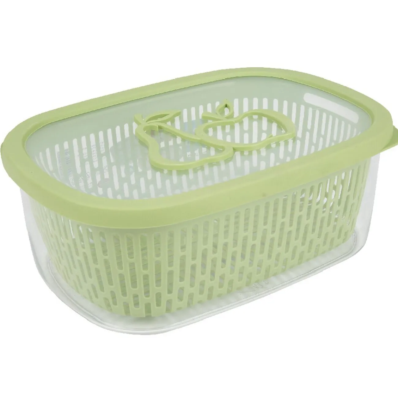 Boîte alimentaire hermétique transparente et verte motif fruits.