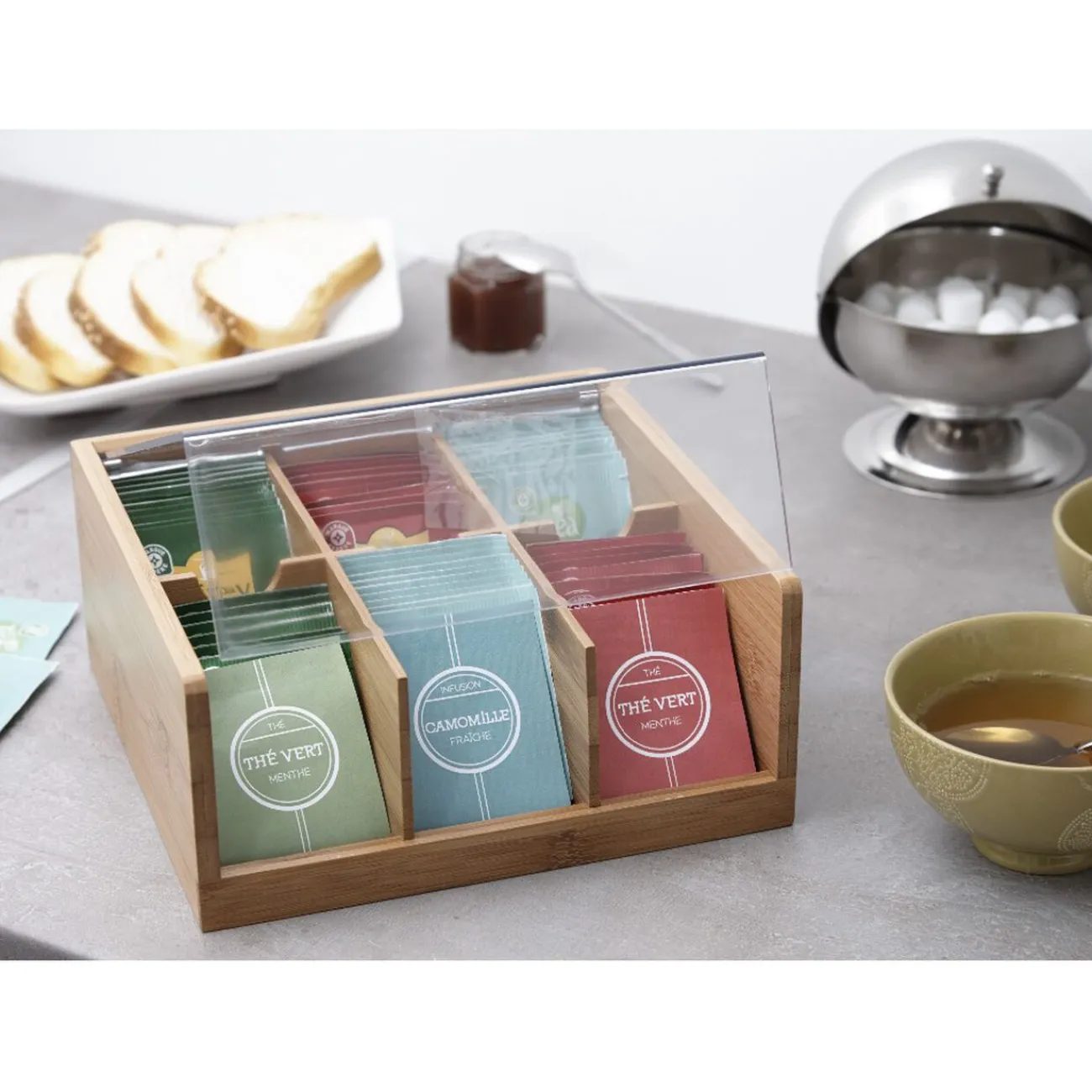 Fabriquée en bambou, cette jolie boîte de rangement à 6 compartiments pour sachets de thé apportera une touche naturelle et élégante à toutes vos pauses infusions. Grâce à son couvercle transparent, repérez en un coup d’oeil vos parfums préférés!