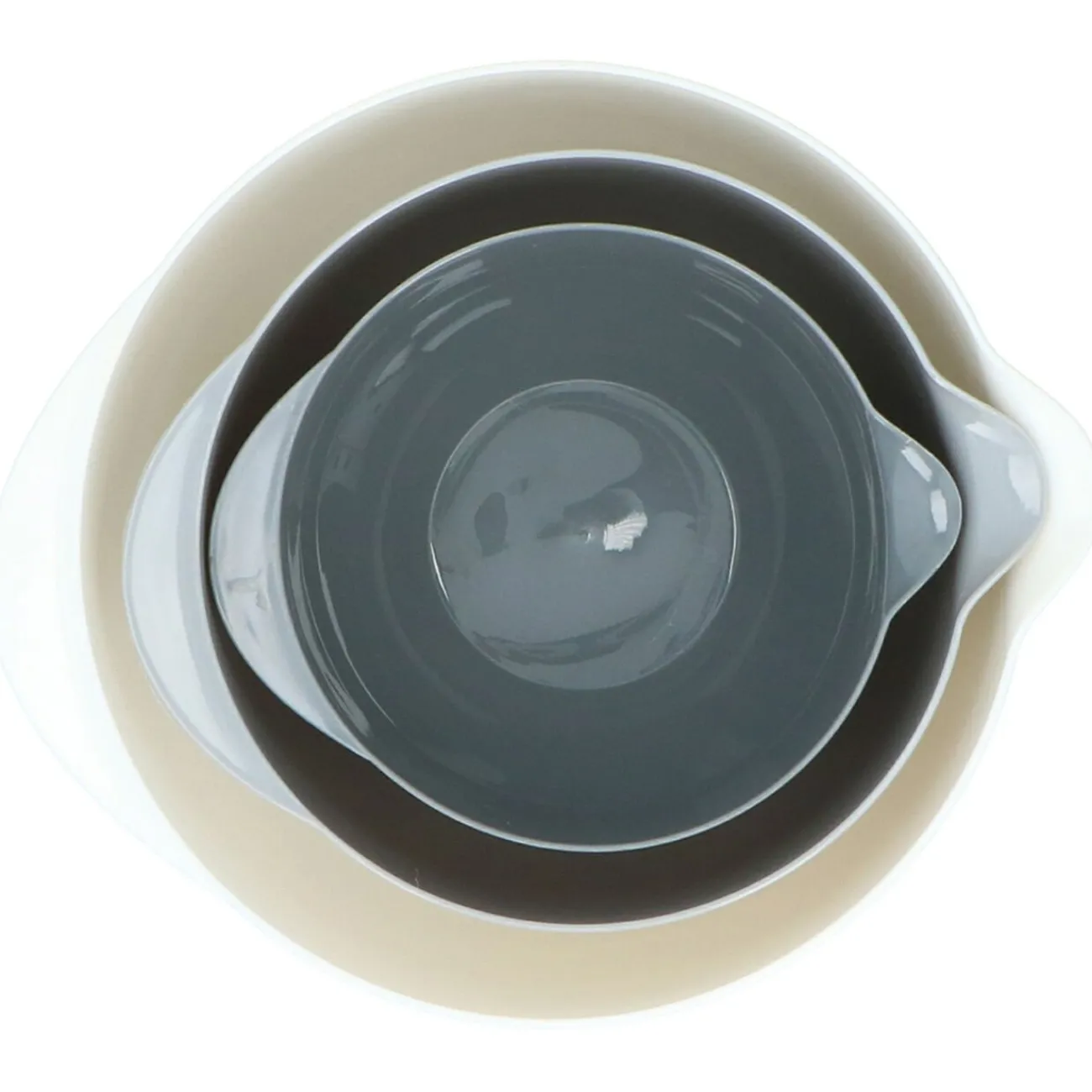 Lot de 3 bols en plastique gris et blanc avec couvercle transparent.