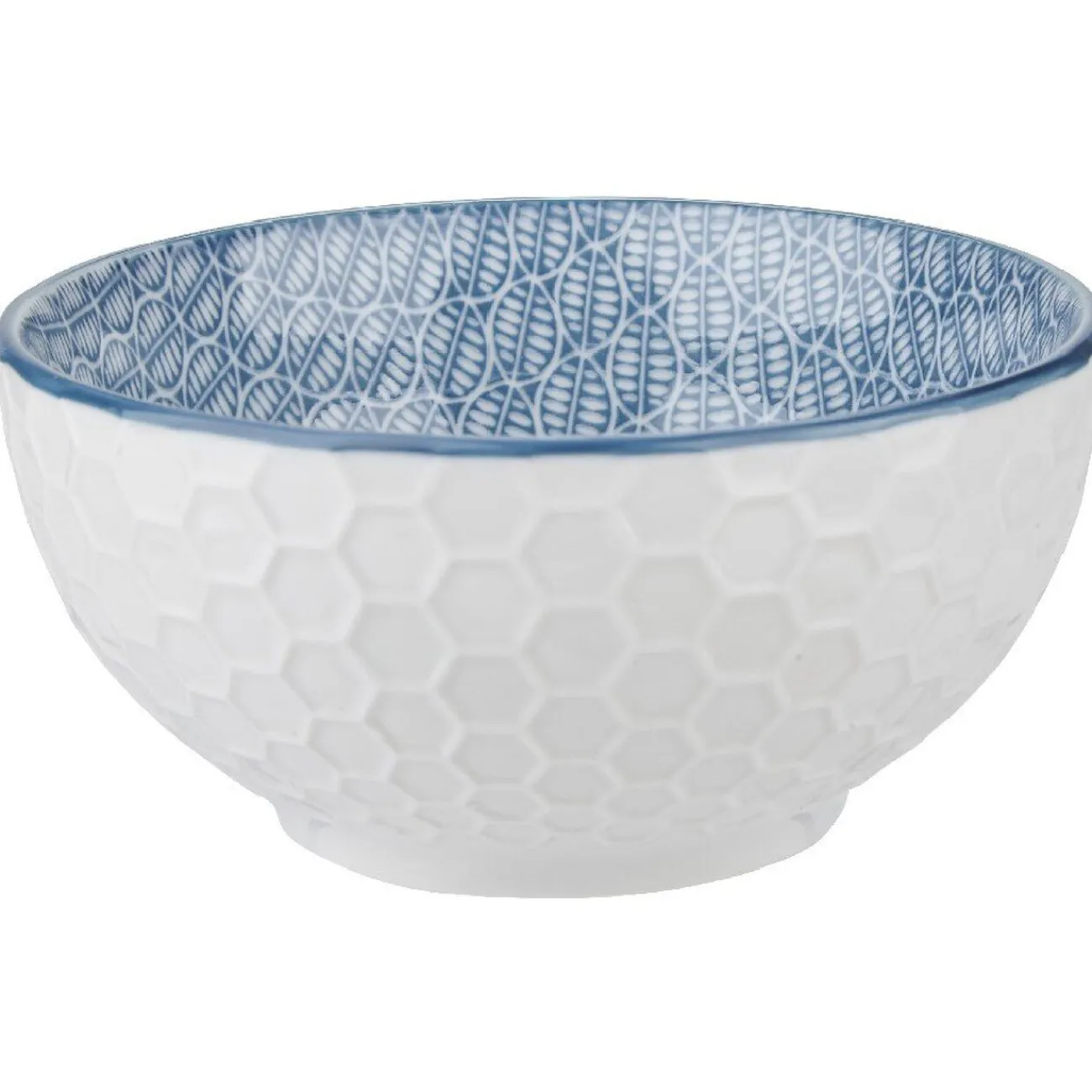 Lot de 4 japonais en porcelaine avec motifs géométriques similaires et couleurs pastels différentes pour chacun des bols : un rouge, un vert, un bleu, un jaune.