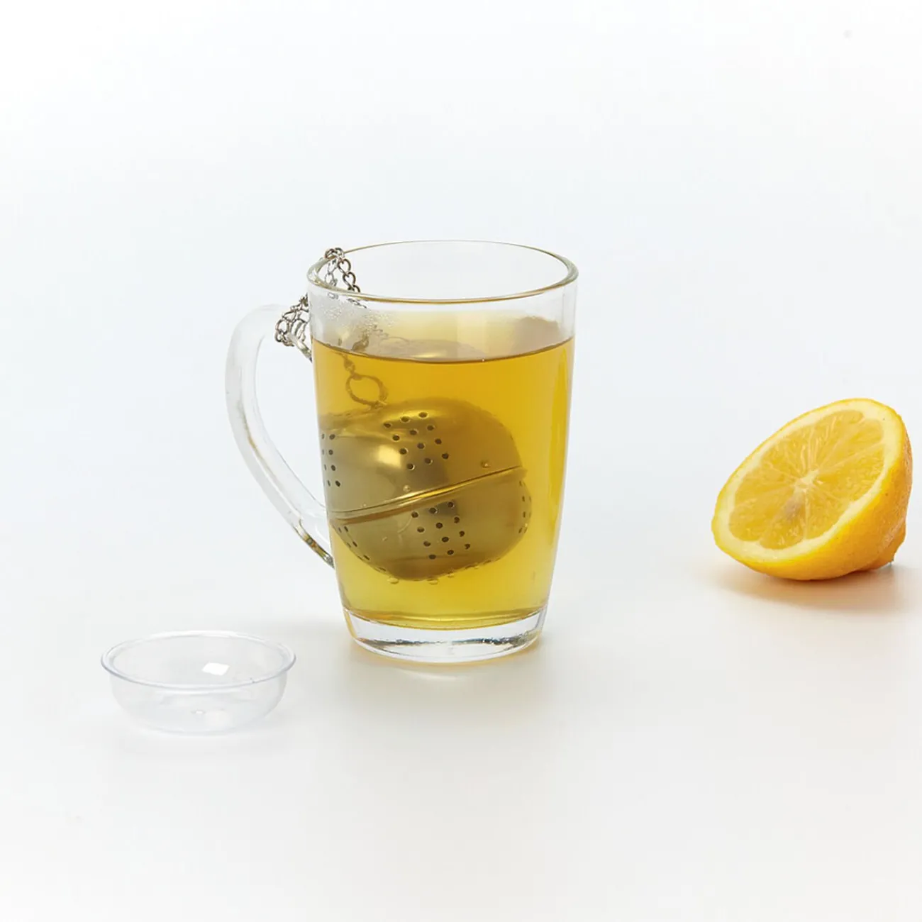 Boule à thé en inox avec son support en plastique transparent.