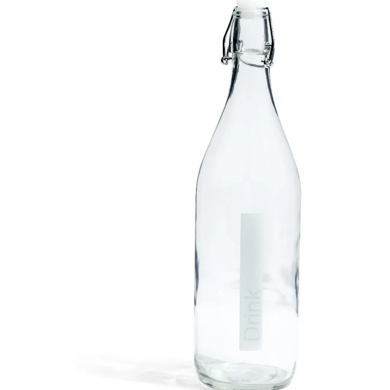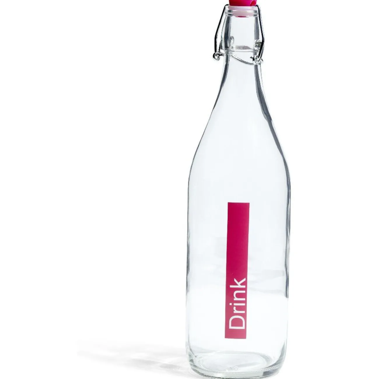 Bouteille en verre d’une contenance de 1 L décorée d’un bouchon coloré et d’une impression DRINK assortie.