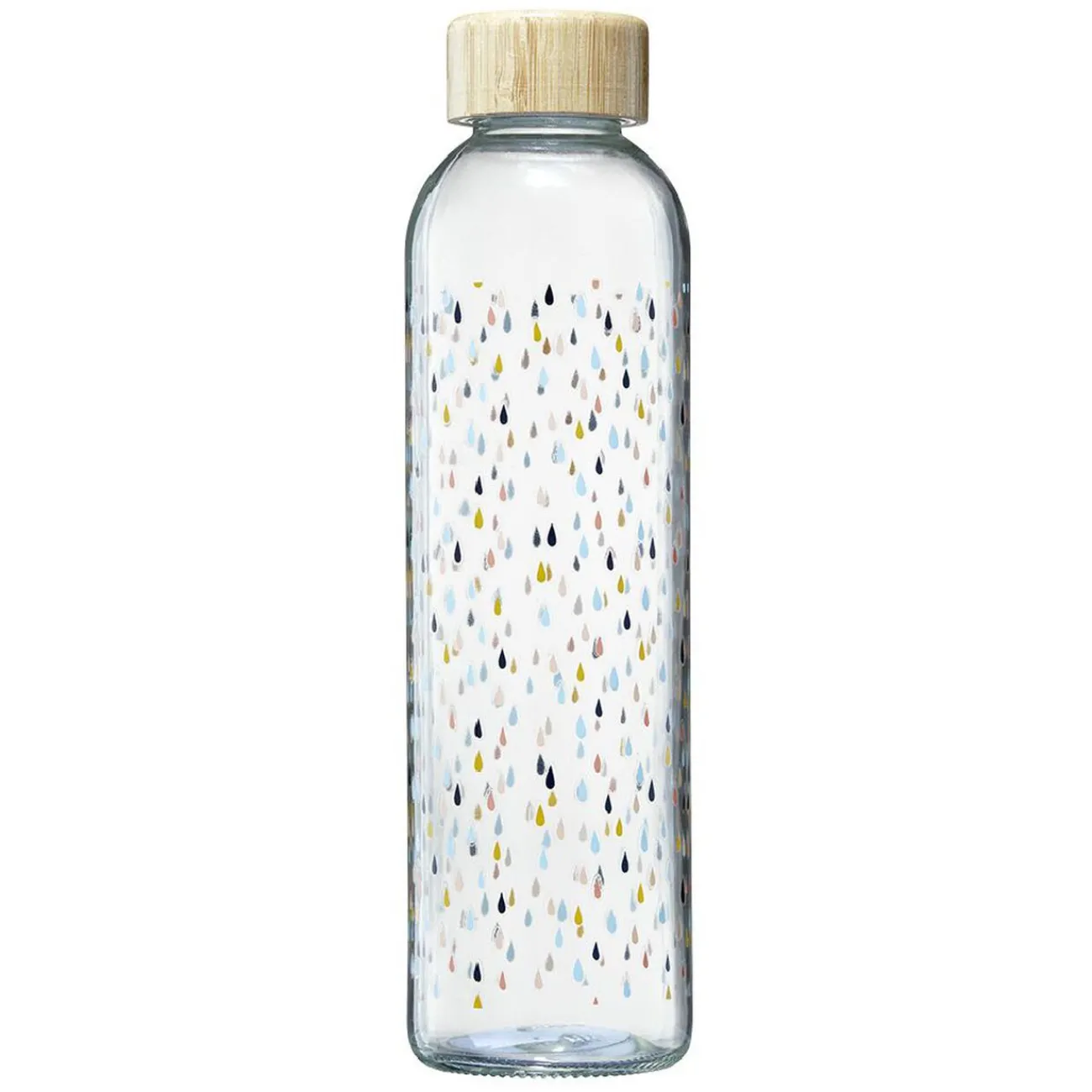 Bouteille en verre transparent à motif gouttes multicolores avec bouchon en bambou naturel. Esthétique et réutilisable à l’infini, cette bouteille sera parfaite sur la table ou pour le bureau pour se rafraîchir tout au long de la journée.