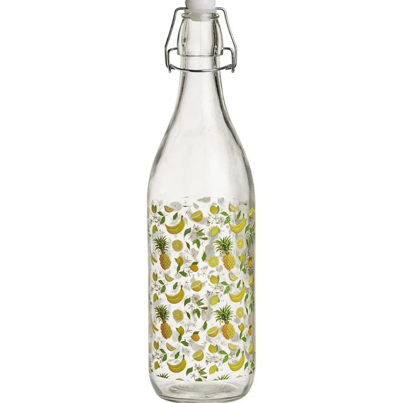 Cette bouteille en verre transparent avec motifs fruits exotiques jaunes et munie d’un bouchon à fermeture mécanique est idéale pour un service au quotidien.