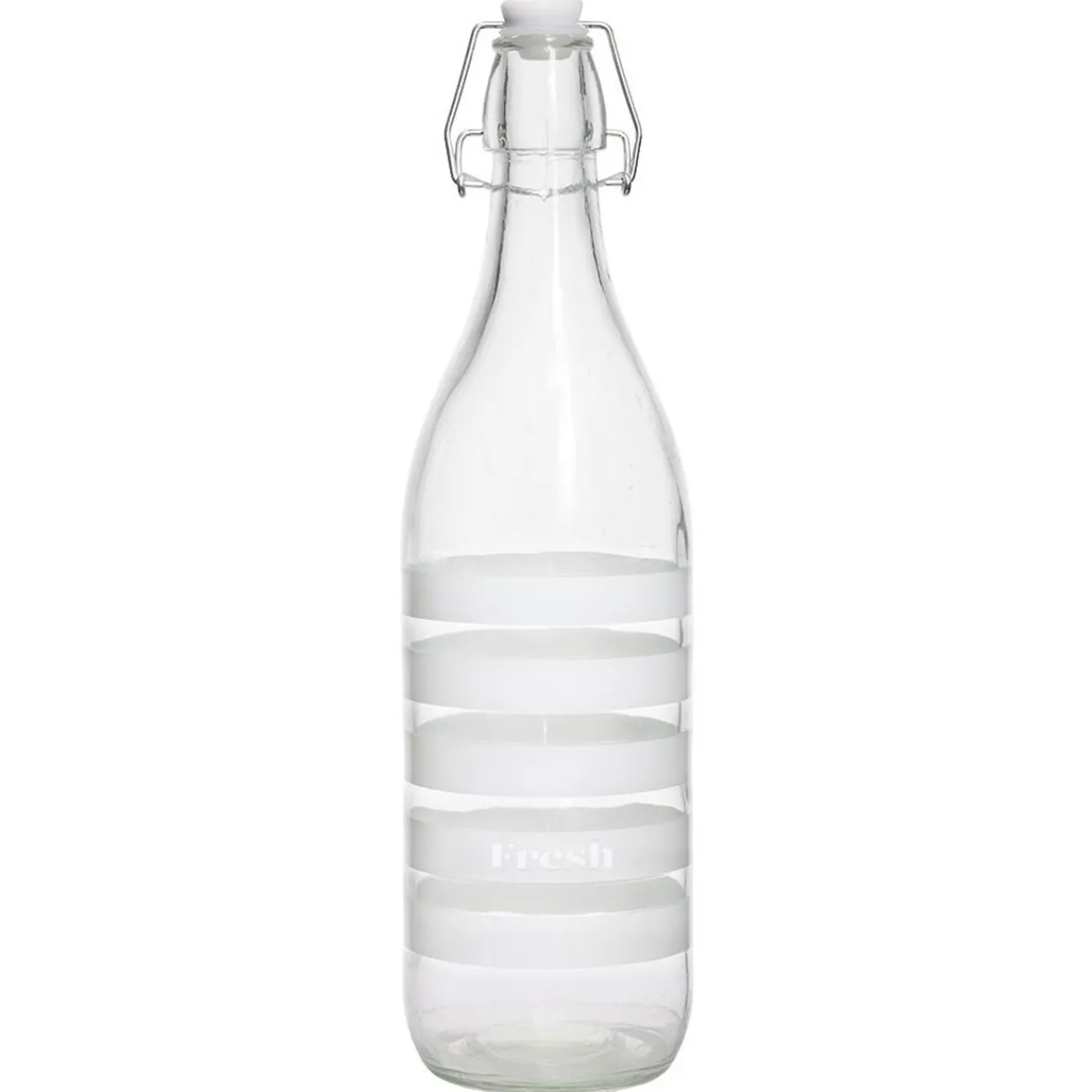 Bouteille en verre transparent avec rayures horizontales blanches sur la partie basse et munie d’un bouchon à fermeture mécanique, idéale pour un service au quotidien.