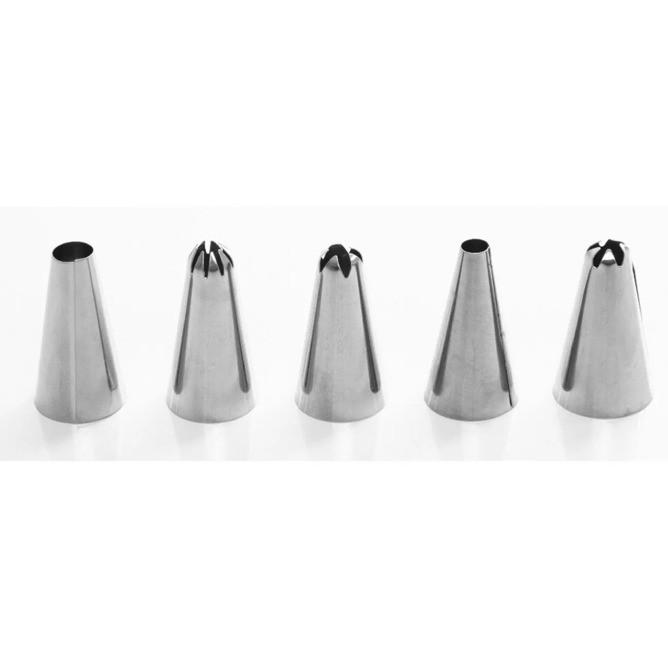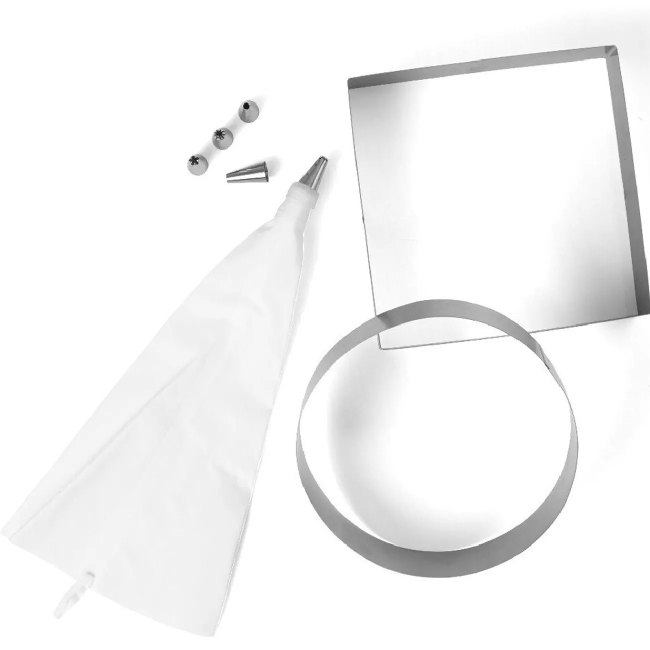 Coffret Gifibox entremets et cheesecakes 9 pièces comprenant 1 cercle à pâtisserie Ø 19,5 cm, 1 carré à pâtisserie dim. 20,5×20,5 cm, 1 poche à douille avec 5 embouts différents et 1 livre de recettes.