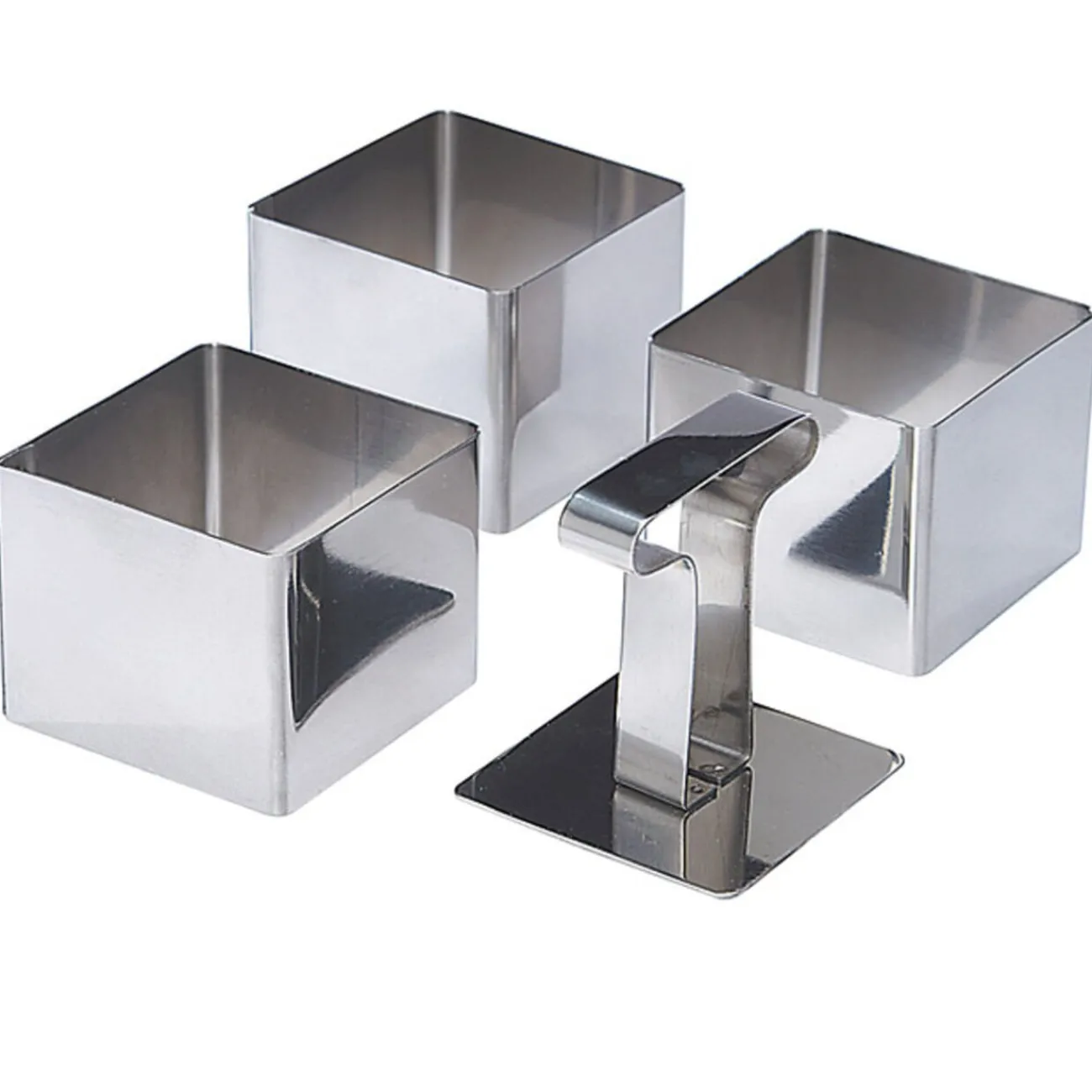 3 carrés de présentation, avec poussoir, dim. 6x6x5 cm, métal.