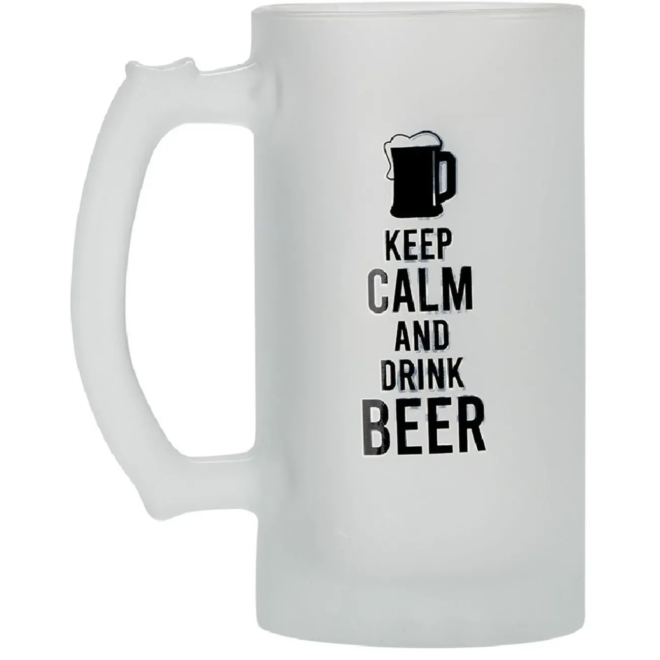 Chope de bière en verre blanc transparent avec inscription humoristique en lettres noires : « Tout travail mérite sa bière » ou « Keep calm and drink beer ».
