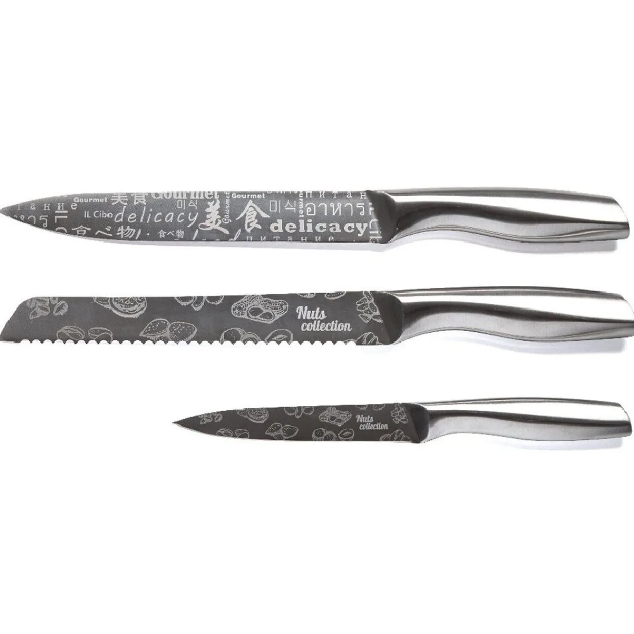 Coffret de 3 couteaux en inox : 1 couteau à pain L. 20 cm, 1 couteau à trancher L. 20 cm et 1 couteau utilitaire L. 11 cm.
