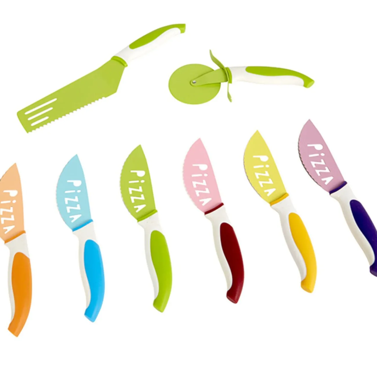 Coffret à pizza en inox 8 pièces comprenant 6 couteaux L. 25 cm, 1 roulette L. 18 cm et 1 spatule L. 25 cm, lames anti-adhérentes.