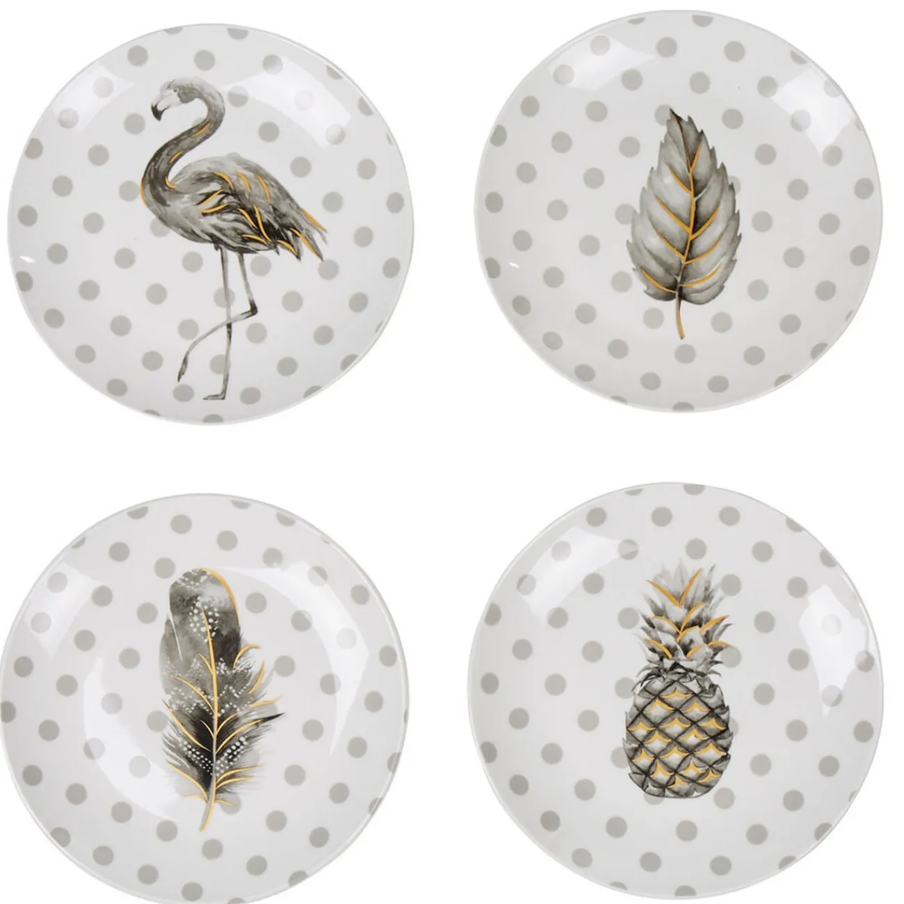 Coffret de 4 assiettes à dessert à fond blanc motifs pois et 4 designs différents de couleur gris et doré :