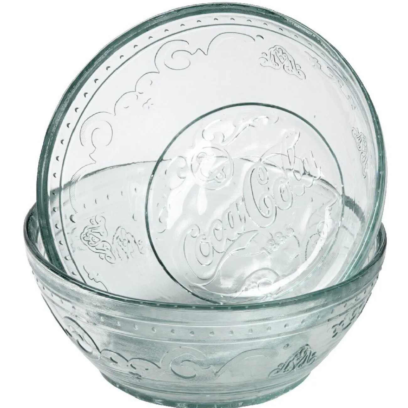 2 coupelles Coca-Cola transparentes, cont. 50 cl, dim. Ø15,5xh.6,5 cm, verre recyclé.