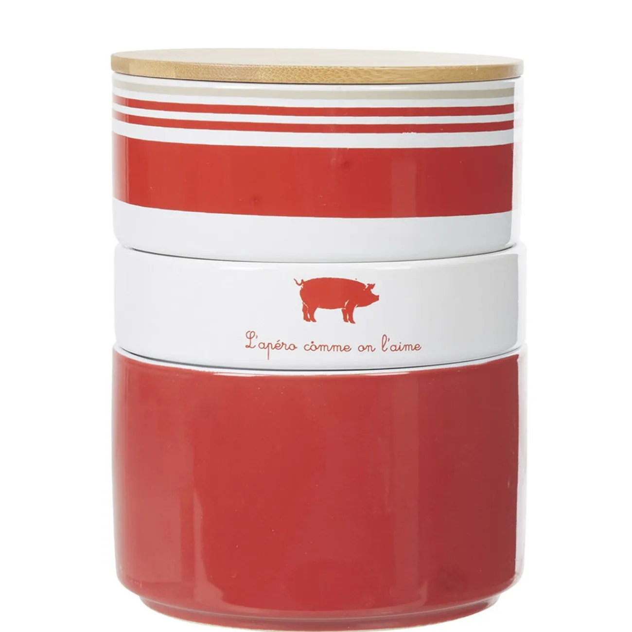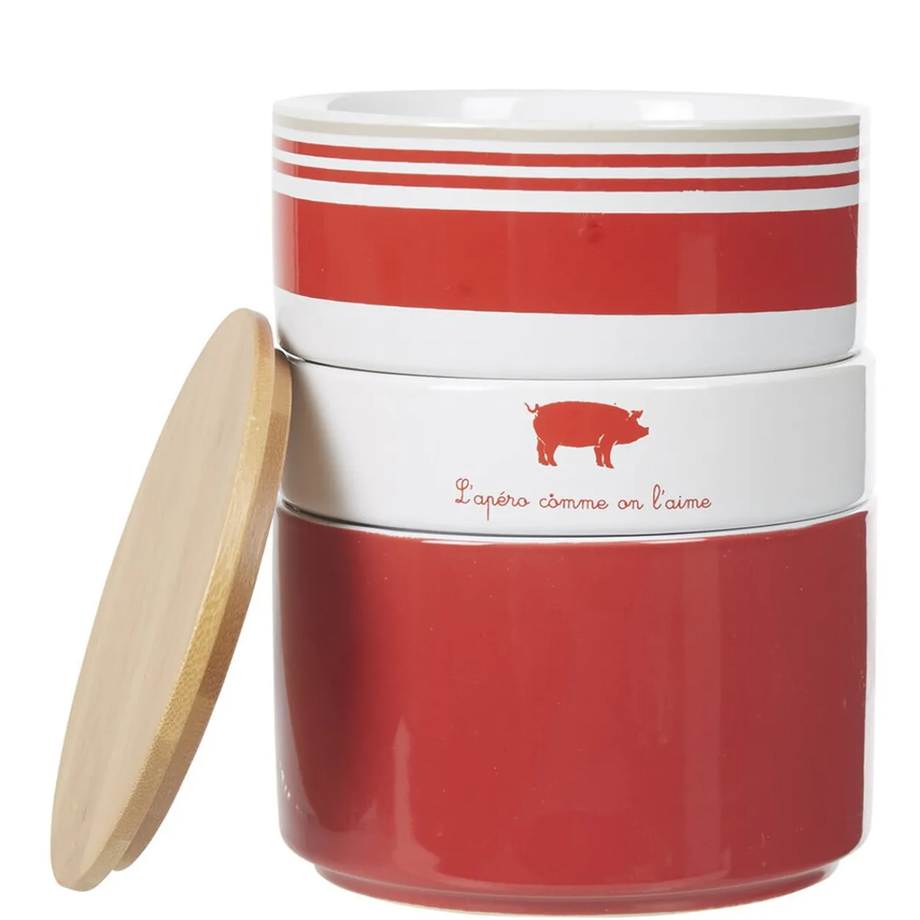 Set de 3 coupelles empilables en faïence rouge et blanc avec couvercle en bambou.