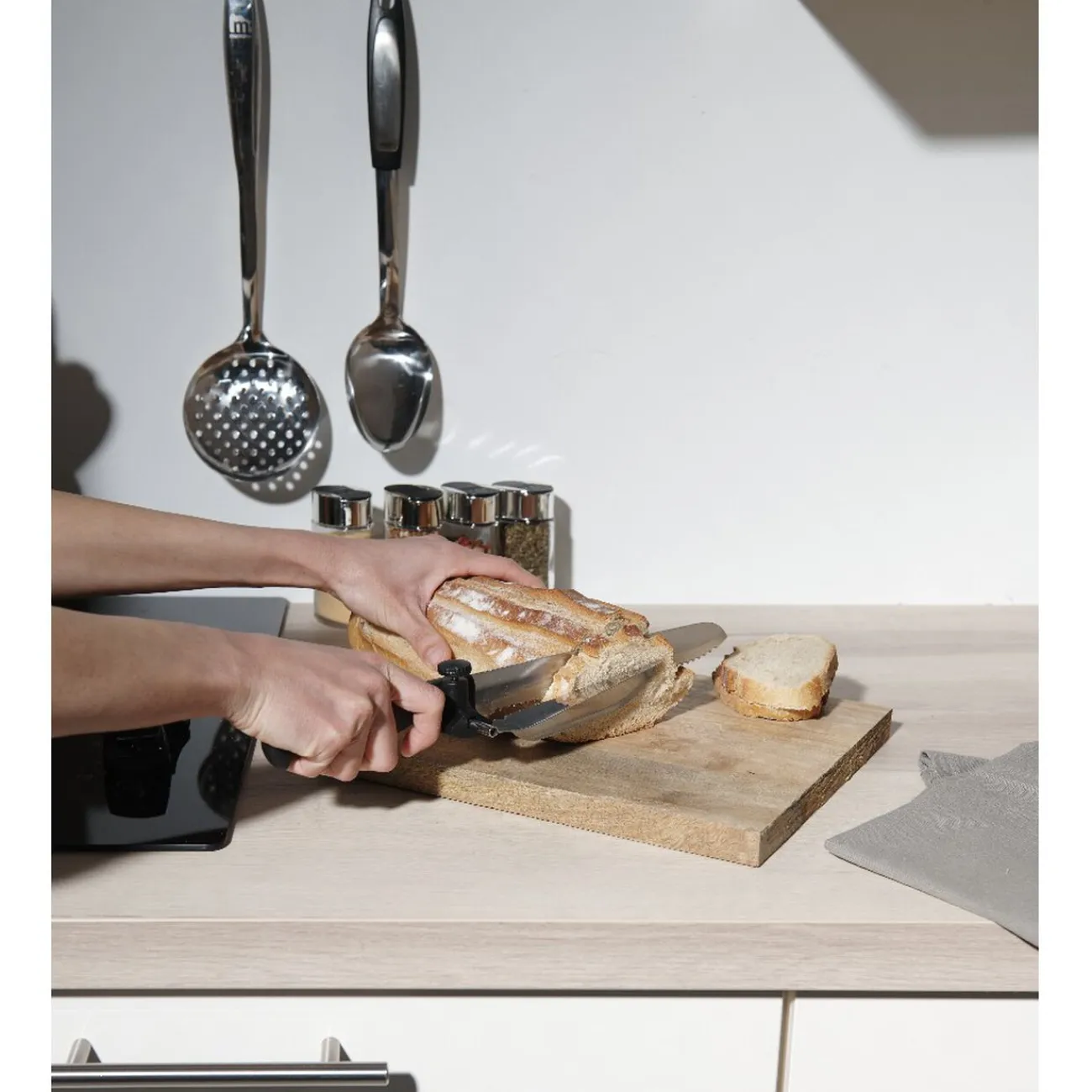 Couteau à trancher réglable en inox qui permet de couper des tranches minces ou plus épaisses proprement et uniformément.