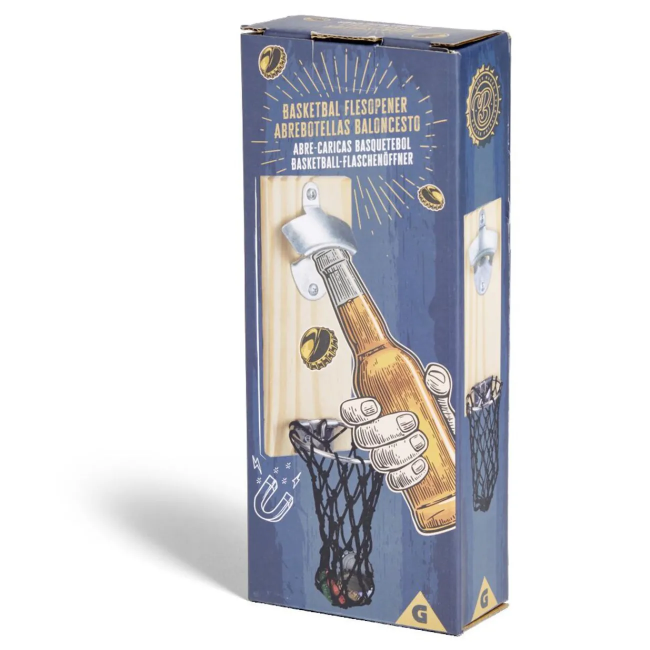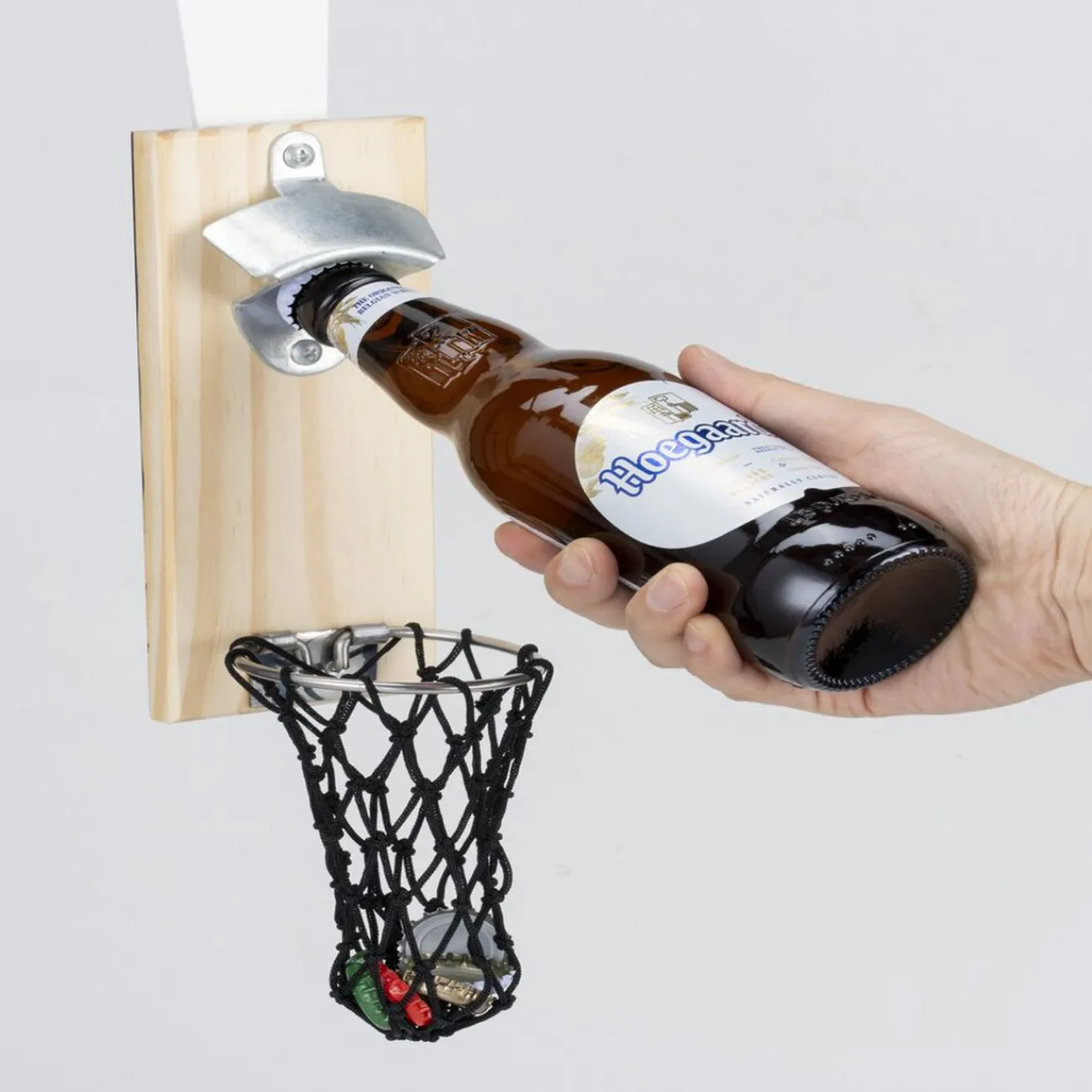 Ajoutez une touche sportive et pratique à votre espace avec ce décapsuleur mural en bois façon panier de basket.