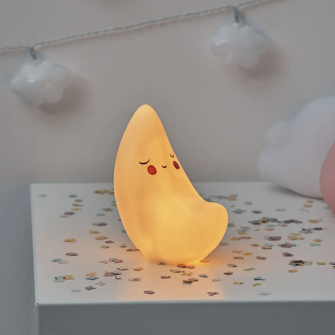 Veilleuse en forme de lune jaune avec mignon petit visage dessiné. Idéal pour rassurer votre enfant lorsqu’il s’endormira ou se reveillera pendant la nuit.