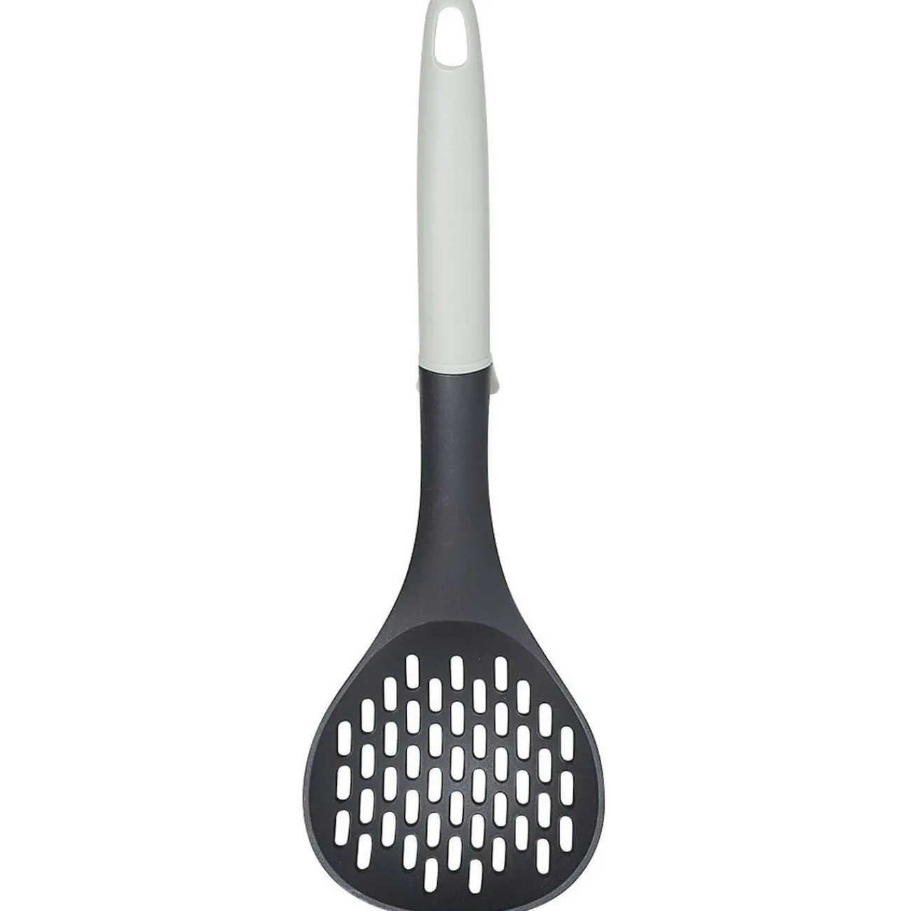 Écumoire en polyamide noir avec manche ergonomique gris.