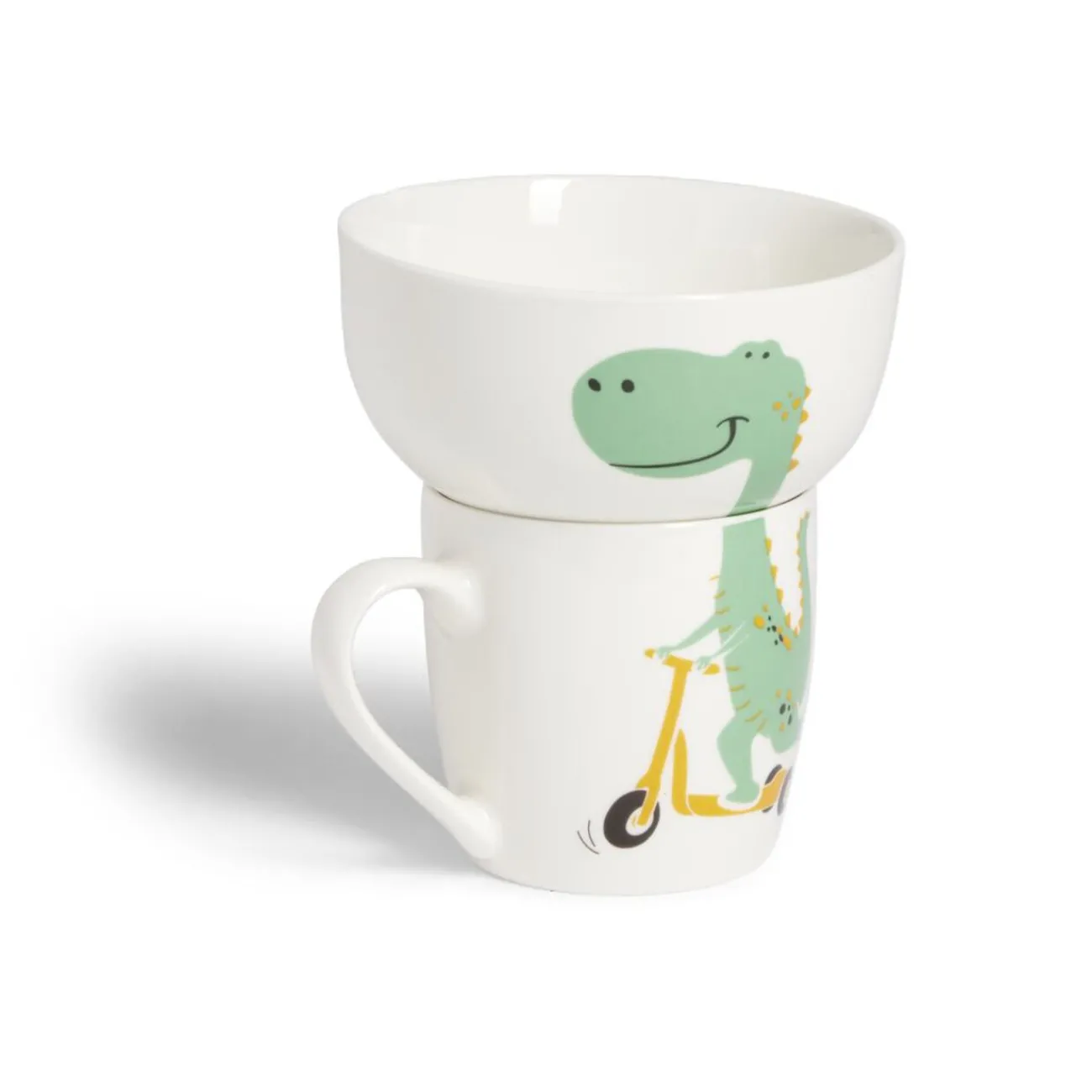 Découvrez cet ensemble bol et mug en porcelaine avec motif dinosaure, idéal pour les petits aventuriers.