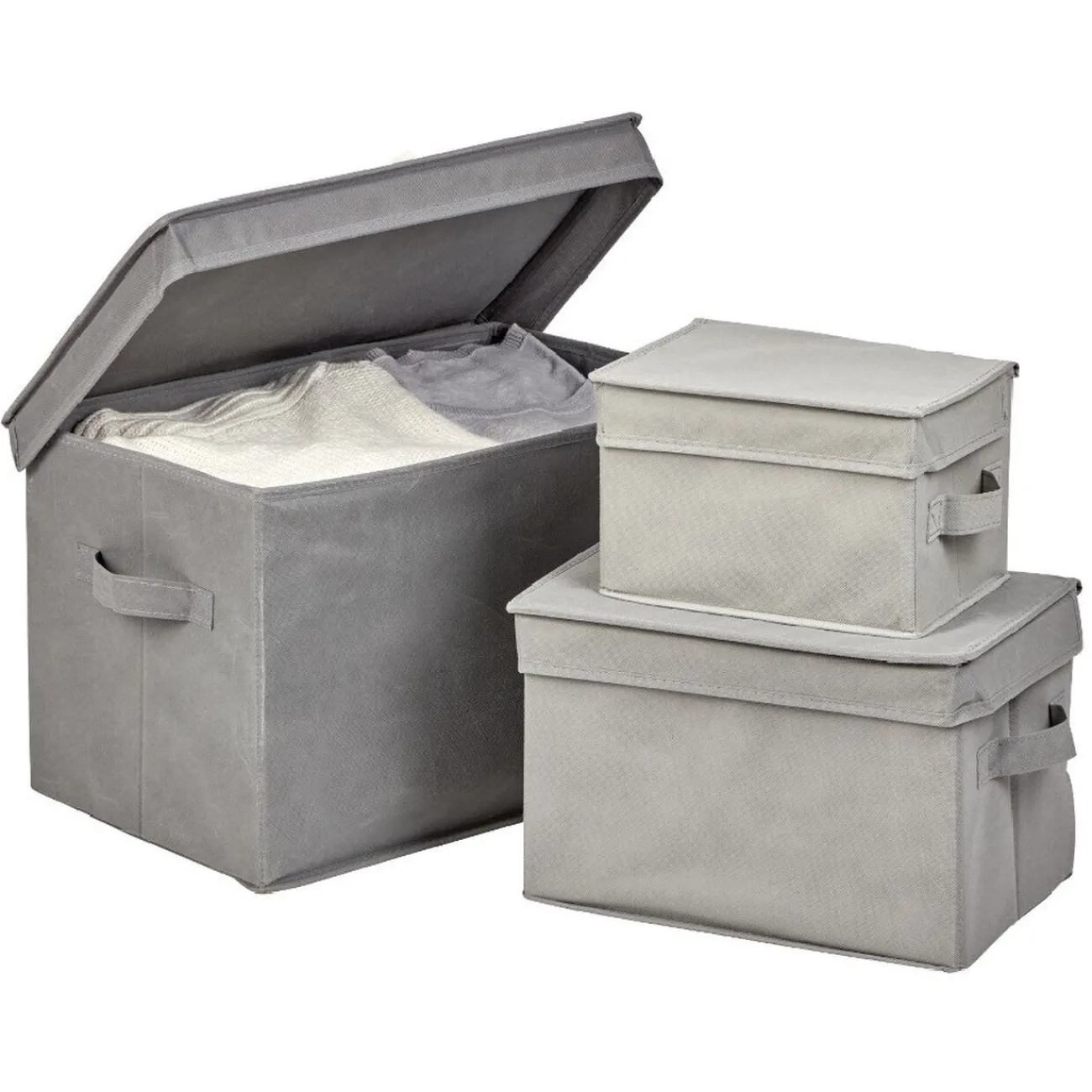 Lot de 3 boîtes de rangement de couleur grise avec couvercle sur le dessus et poignée sur le devant.