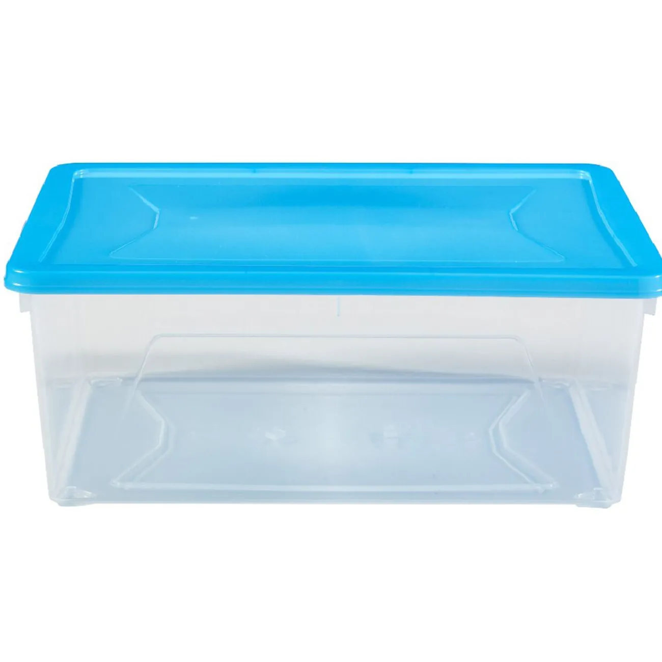 Lot de 6 boîtes de rangement transparentes refermables par leur couvercle bleu, d’une contenance de 10 litres chacune.