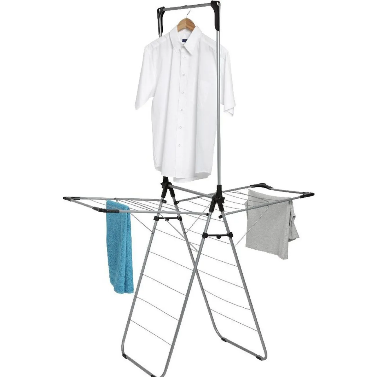 Etendoir à linge avec portant de couleur gris et noir.