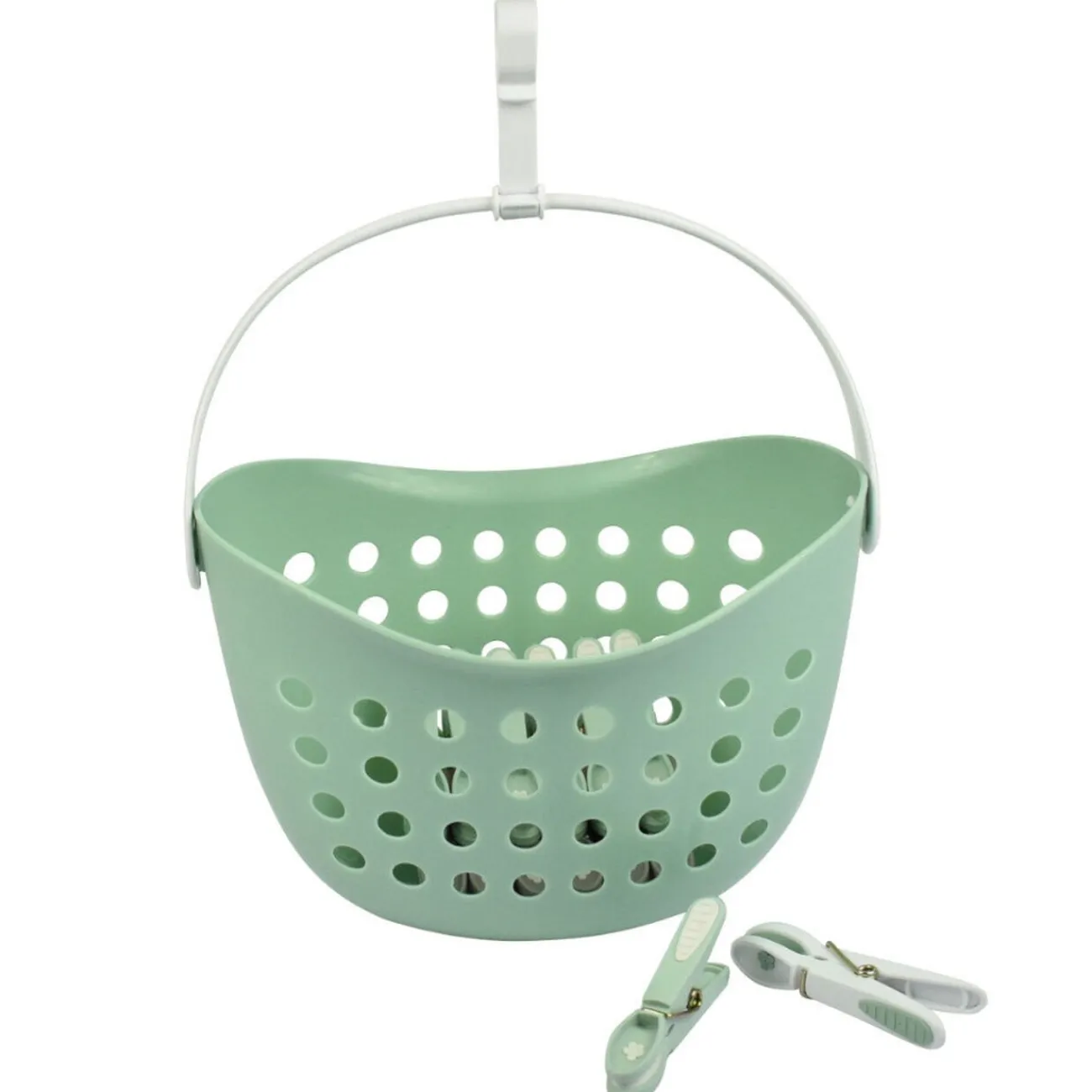 Panier avec 12 pinces à linge vert à suspendre à votre étendoir pour avoir toujours les pinces à linge sous la main.
