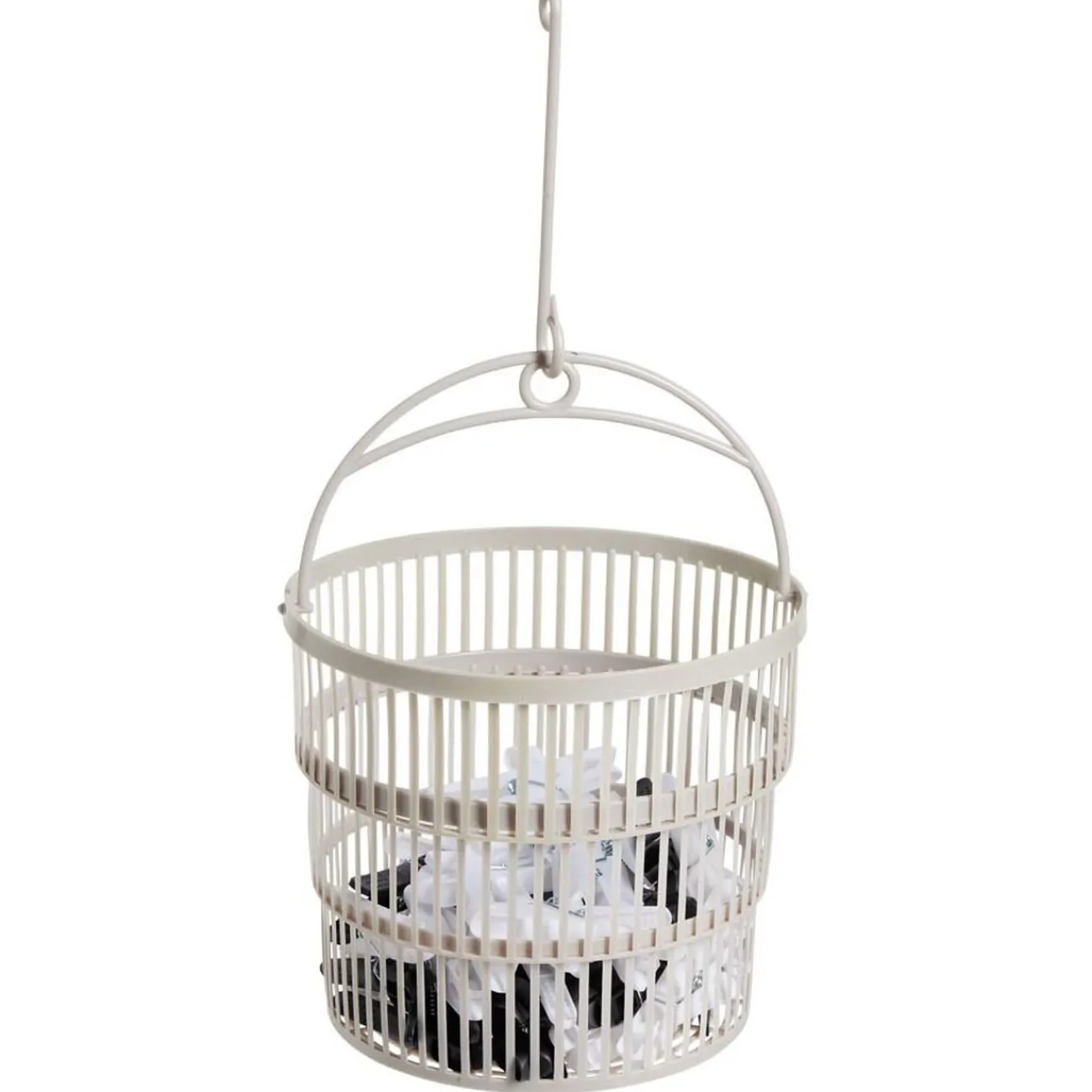 Ce panier en plastique blanc est une solution de rangement pratique pour les 50 pinces à linge tricolores qu’il contient.