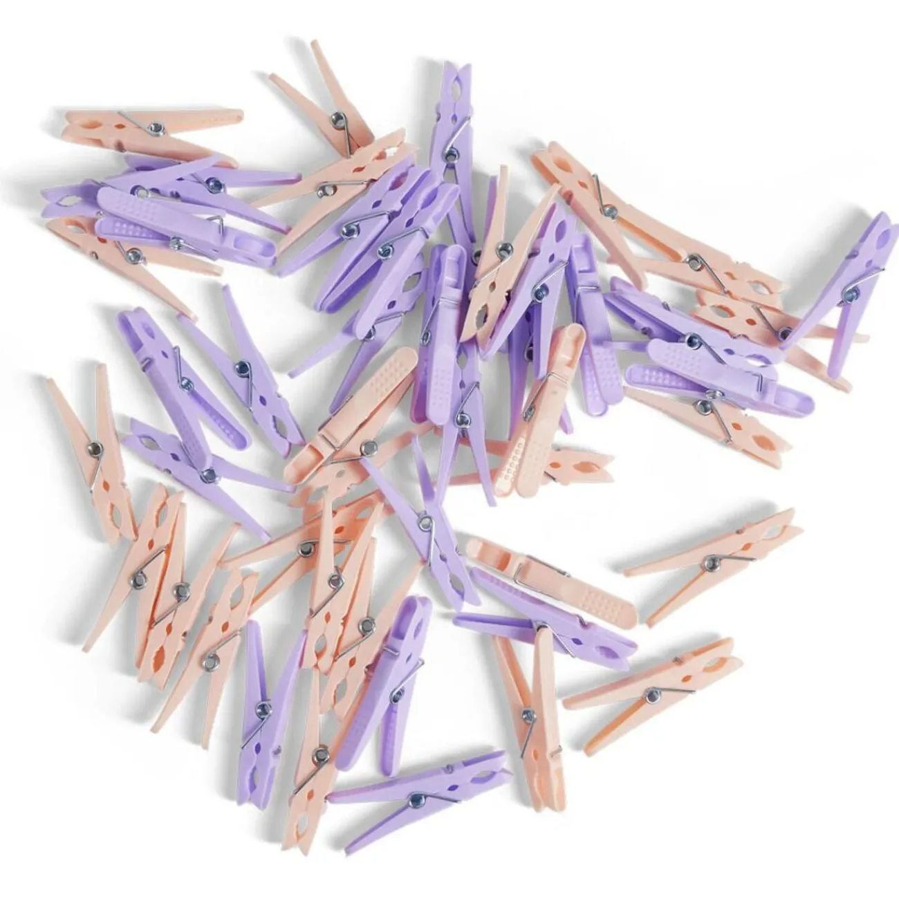Avec son apparence propre et moderne, ce panier en plastique bleu constitue une solution de rangement pratique pour les 50 pinces à linge tricolores qu’il contient.