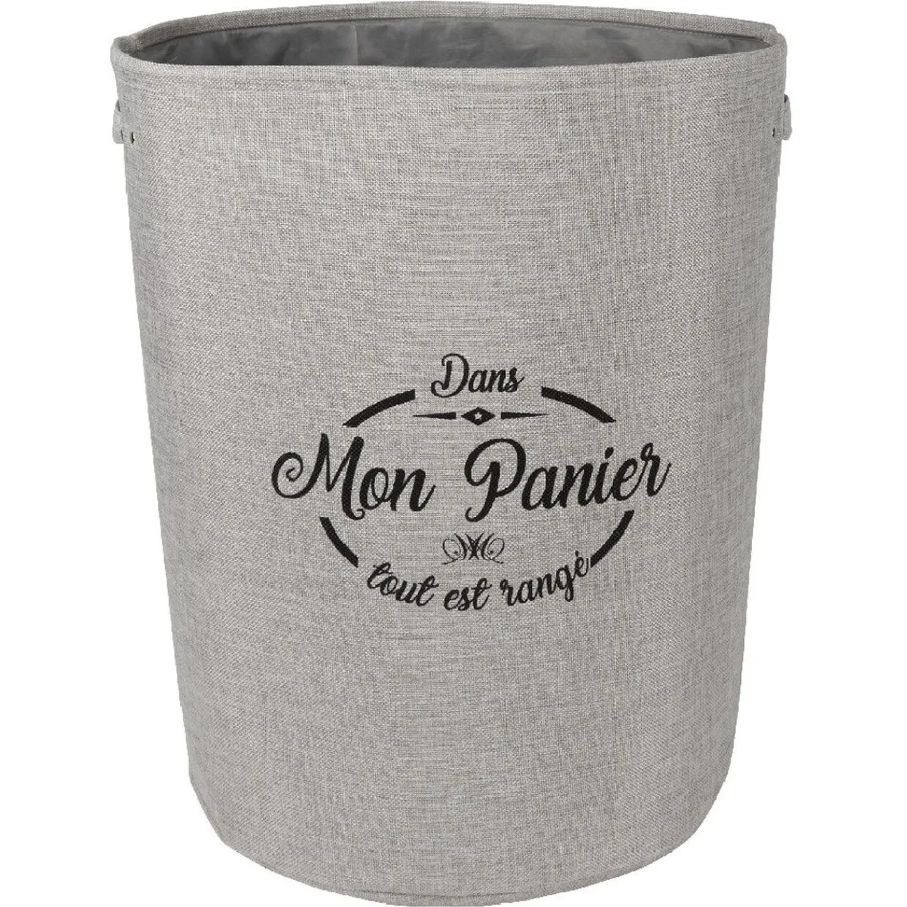 Panier de rangement rond en polyester gris clair avec inscription déco « Dans mon panier tout est rangé ».