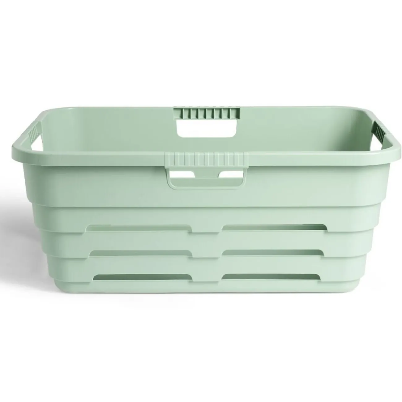 Panier à linge en plastique vert ajouré de couleur avec poignée intégrée sur les 4 côtés pour un transport facilité.