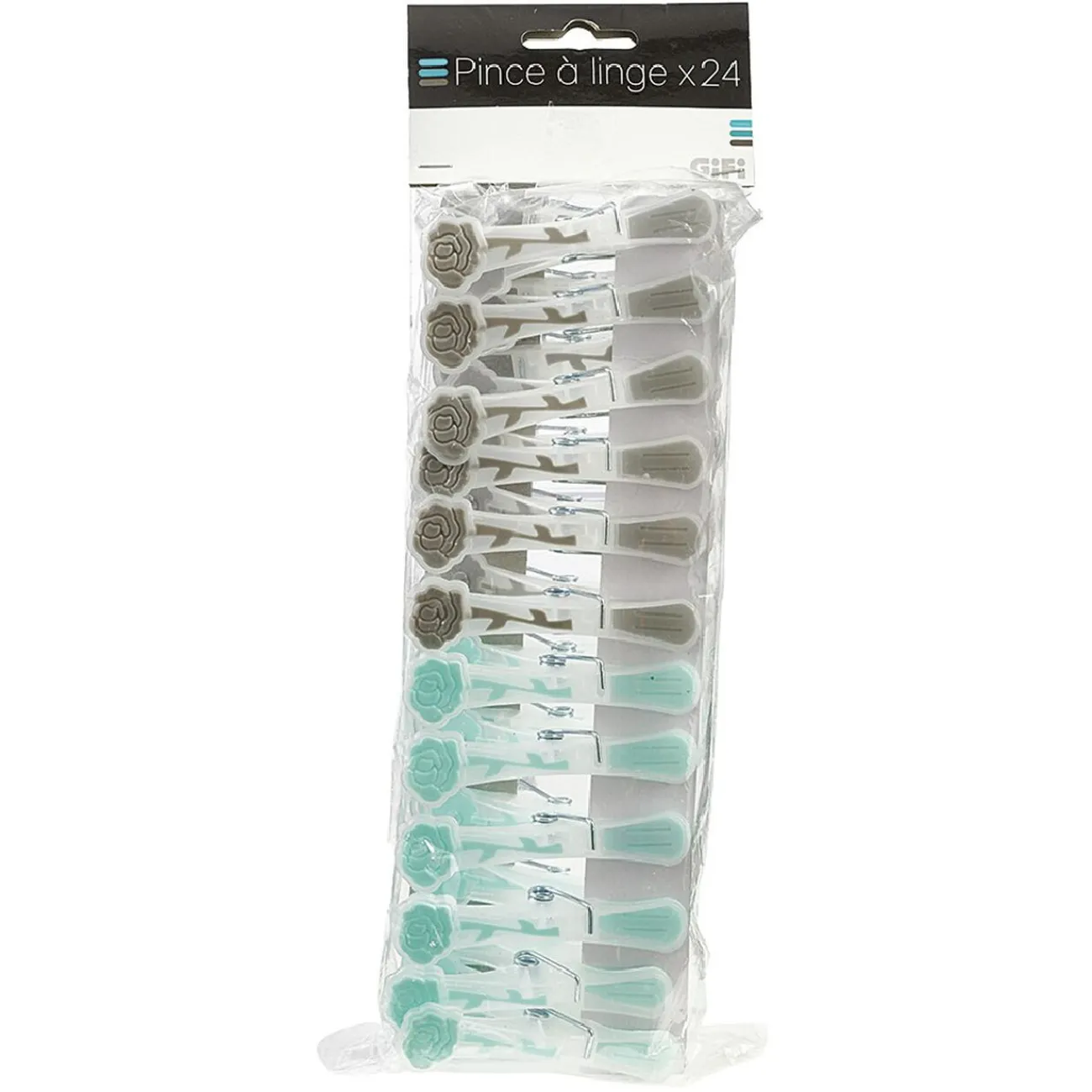 Lot de 24 pinces à linge dont 12 bleues transparentes et 12 grises transparentes.