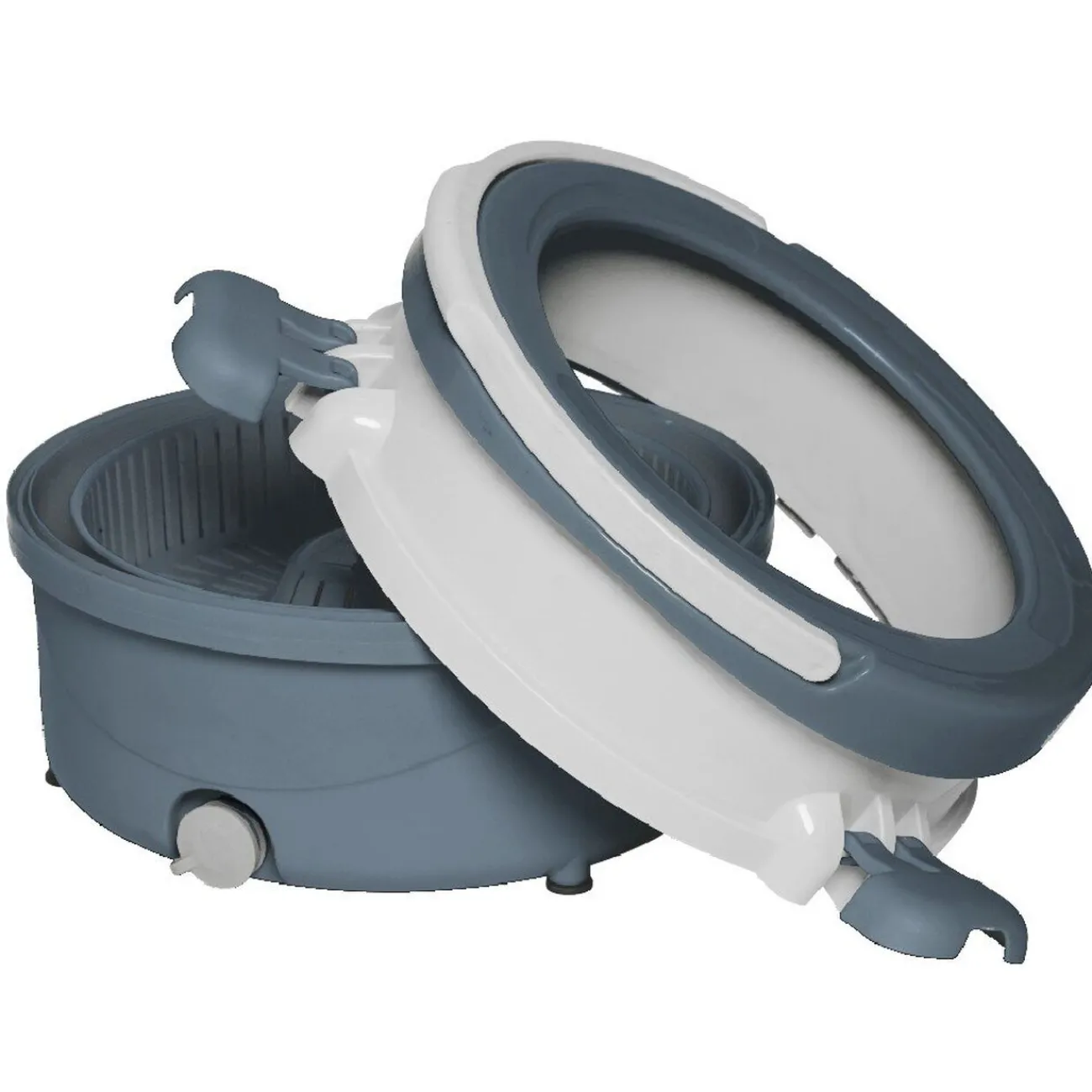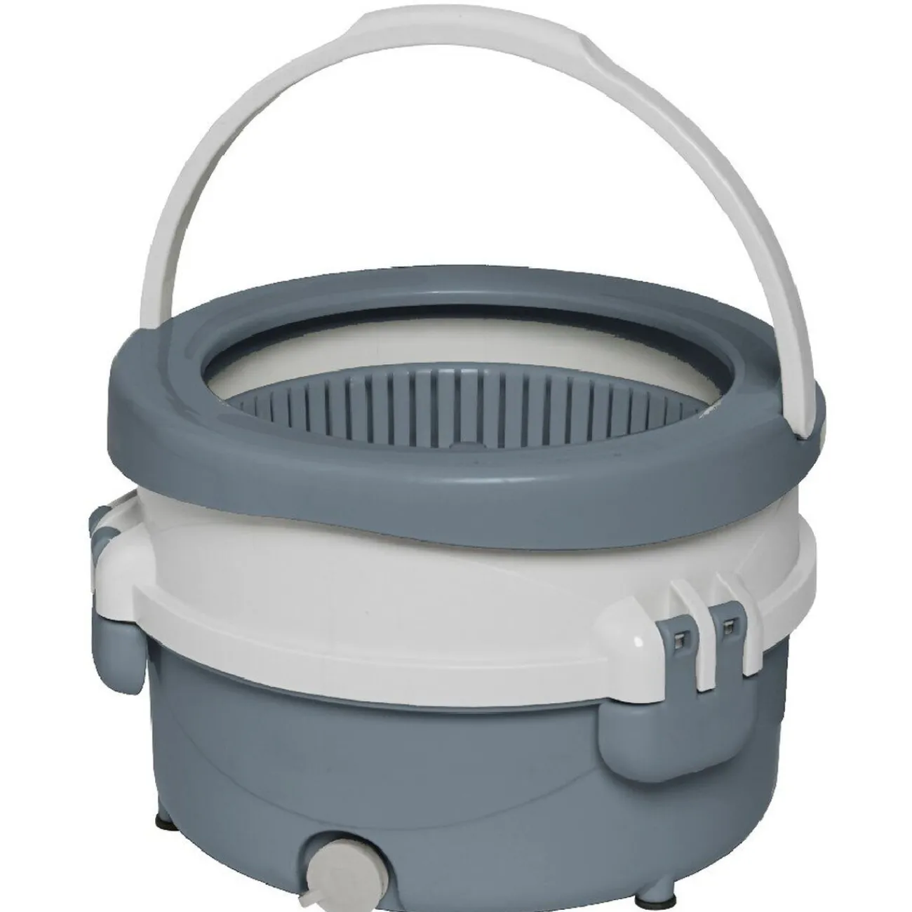 Seau essoreur rond avec balai rotatif blanc et gris, avec bouchon de vidange pour vider l’eau facilement.