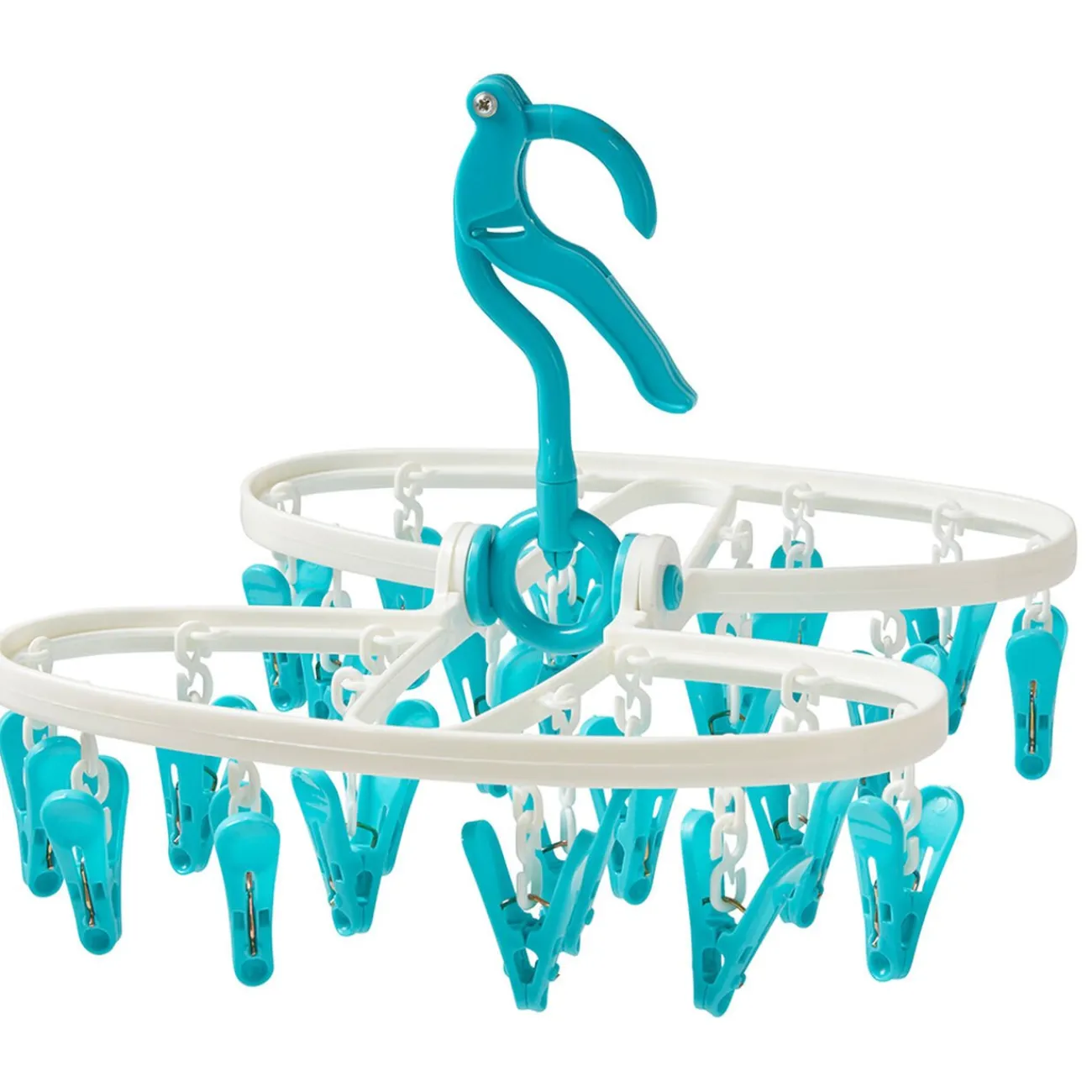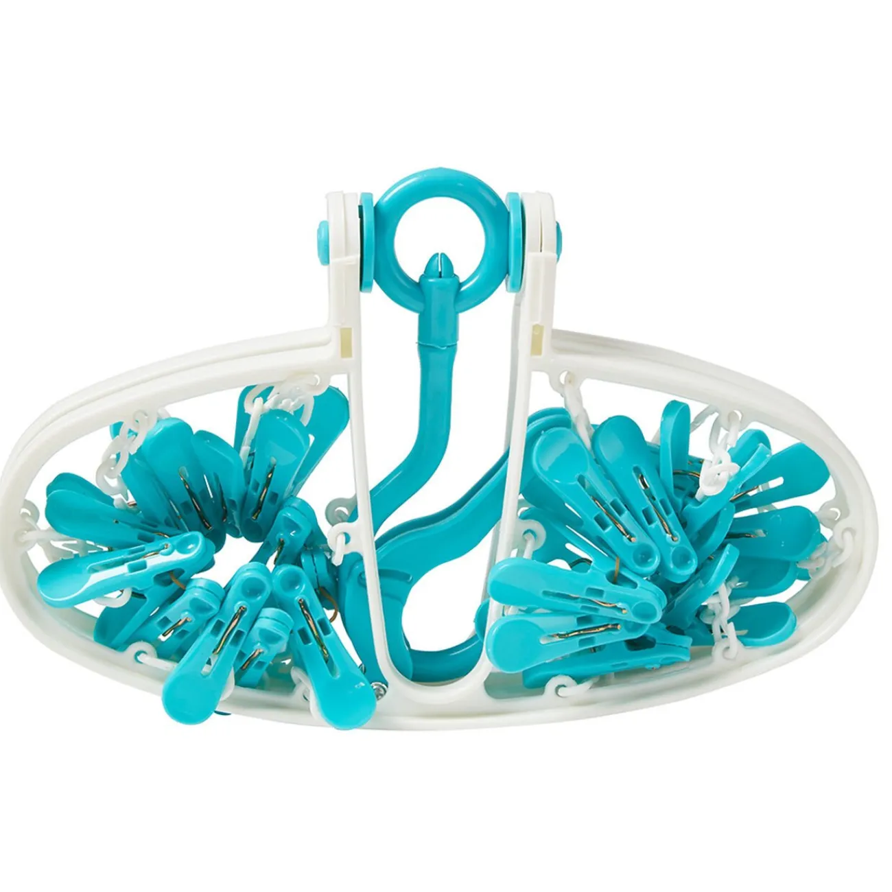 Séchoir à linge à suspendre composé de 24 pinces colorées.
