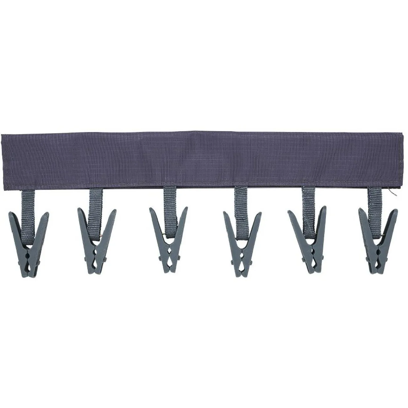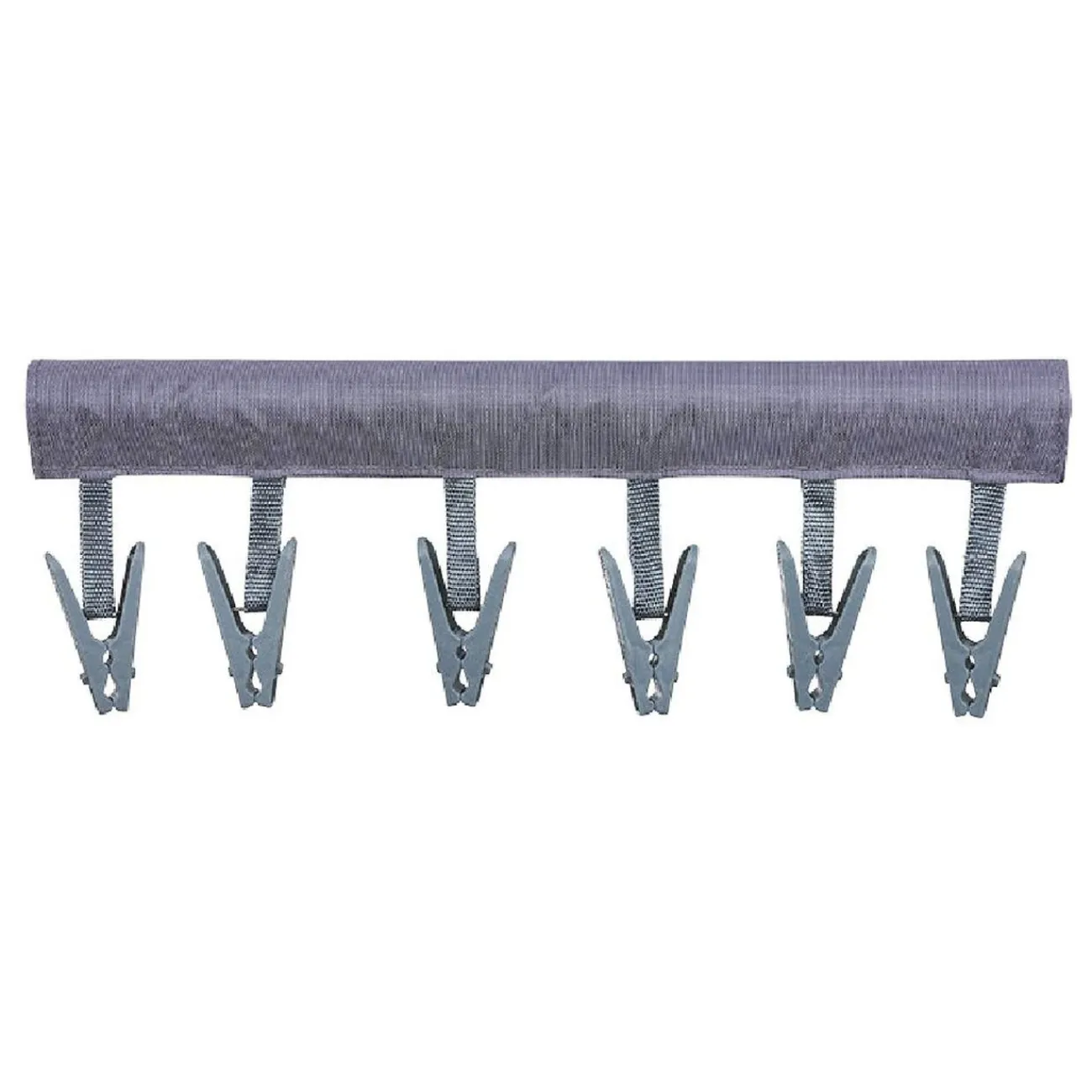 Séchoir pliable en tissu doté de 6 pinces à linge, pratique en voyage pour étendre votre linge en vacances.
