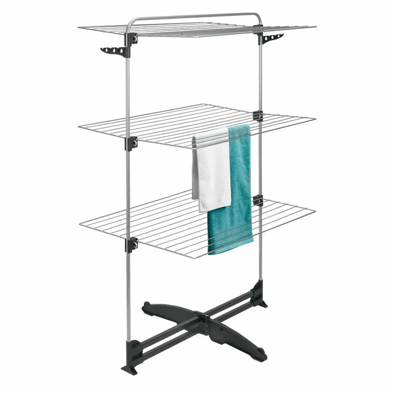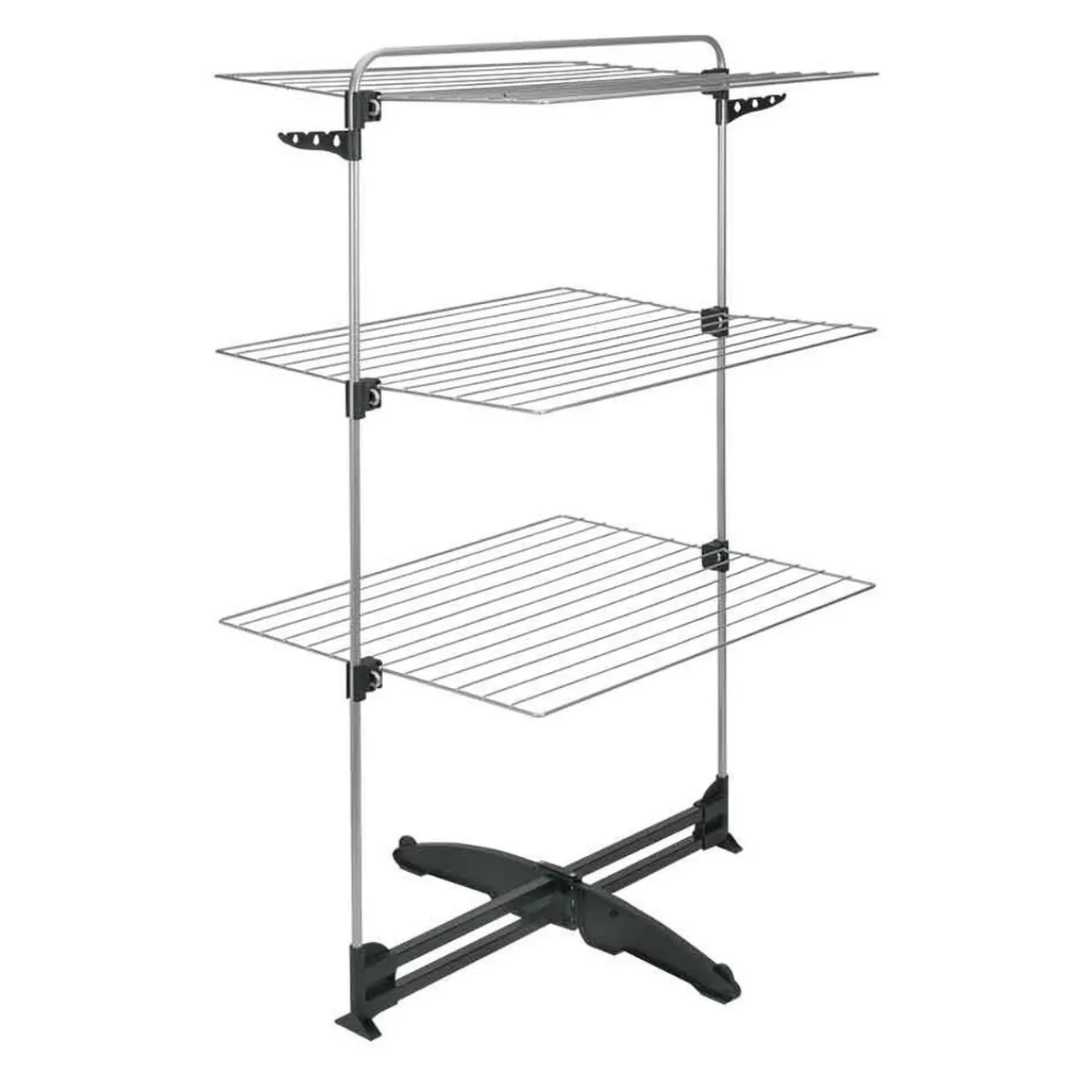 Séchoir tour sur 3 niveaux avec double porte-cintres et revêtement EPOTHERM, résistant et facile d’entretien.