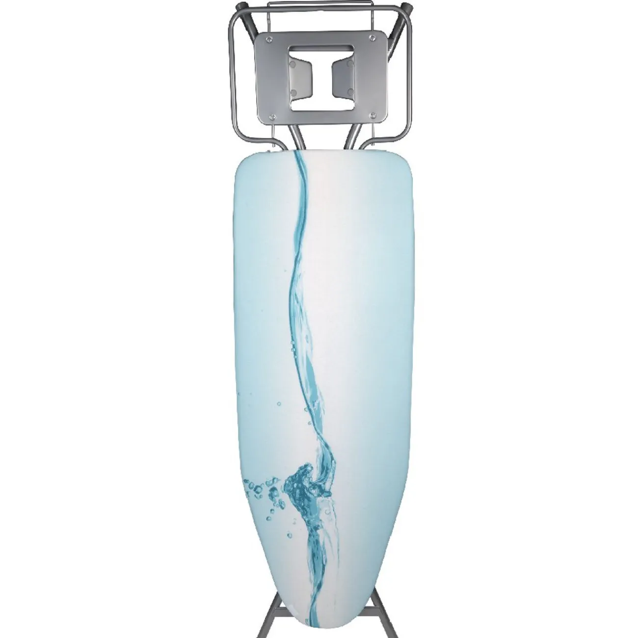 Table à repasser pliante de couleur bleue avec un support pour le fer et la centrale vapeur. Structure de métal et housse en coton.
