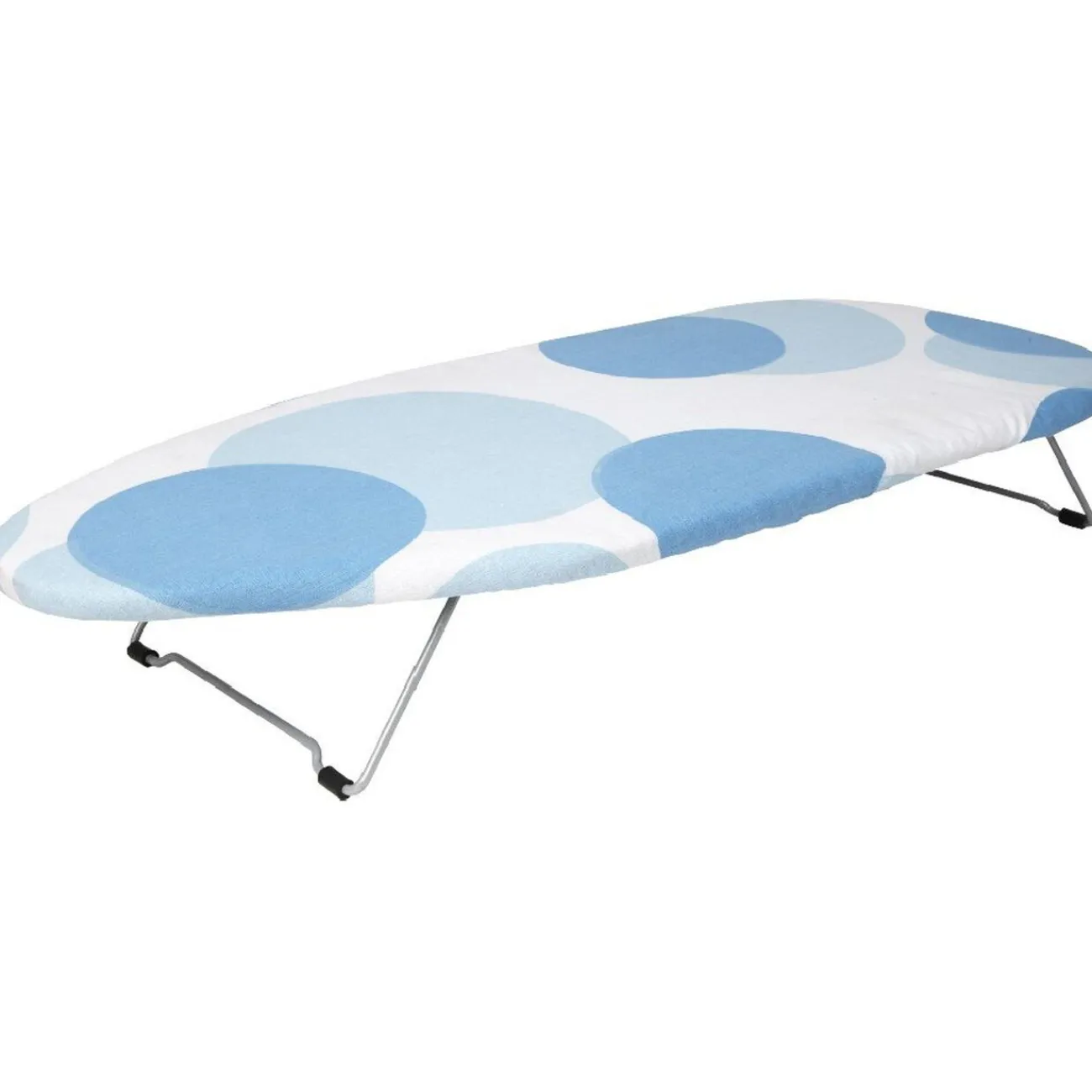 Table à repasser d’appoint, housse blanche à pois bleus, dim. 73x32xh.12,5 cm, acier et coton. Pied rétractable et accroche de rangement.