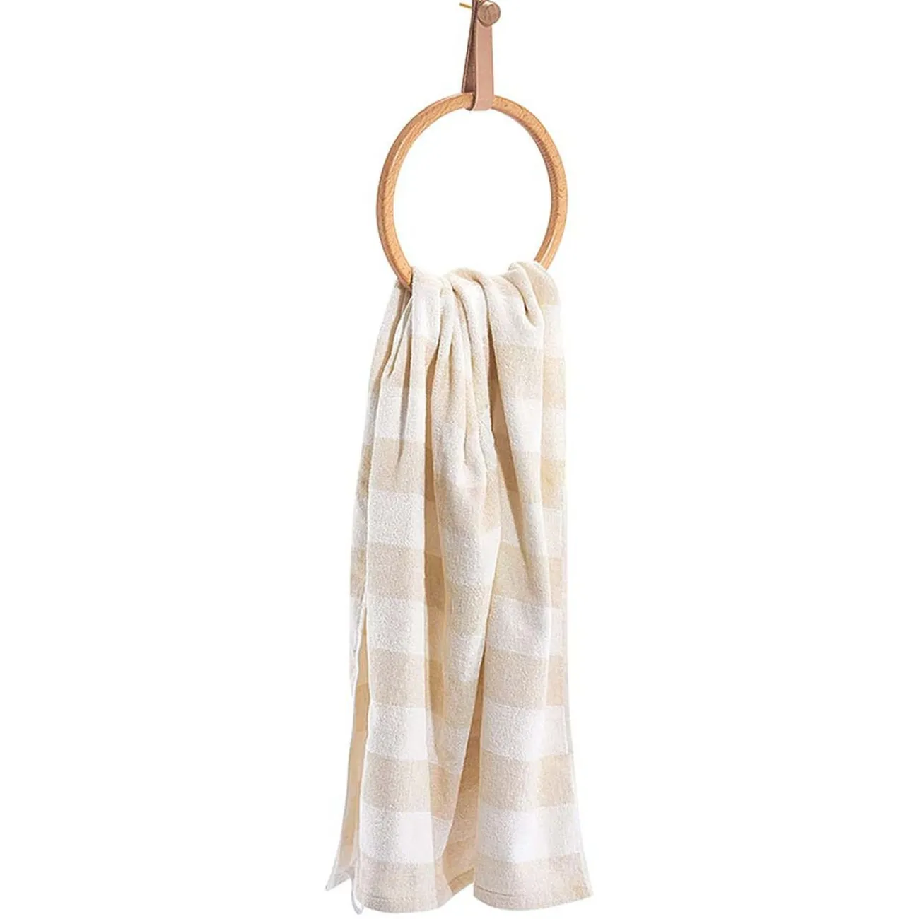 Porte serviette à fixer au mur composé d’un anneau en bois et d’une attache en cuir.