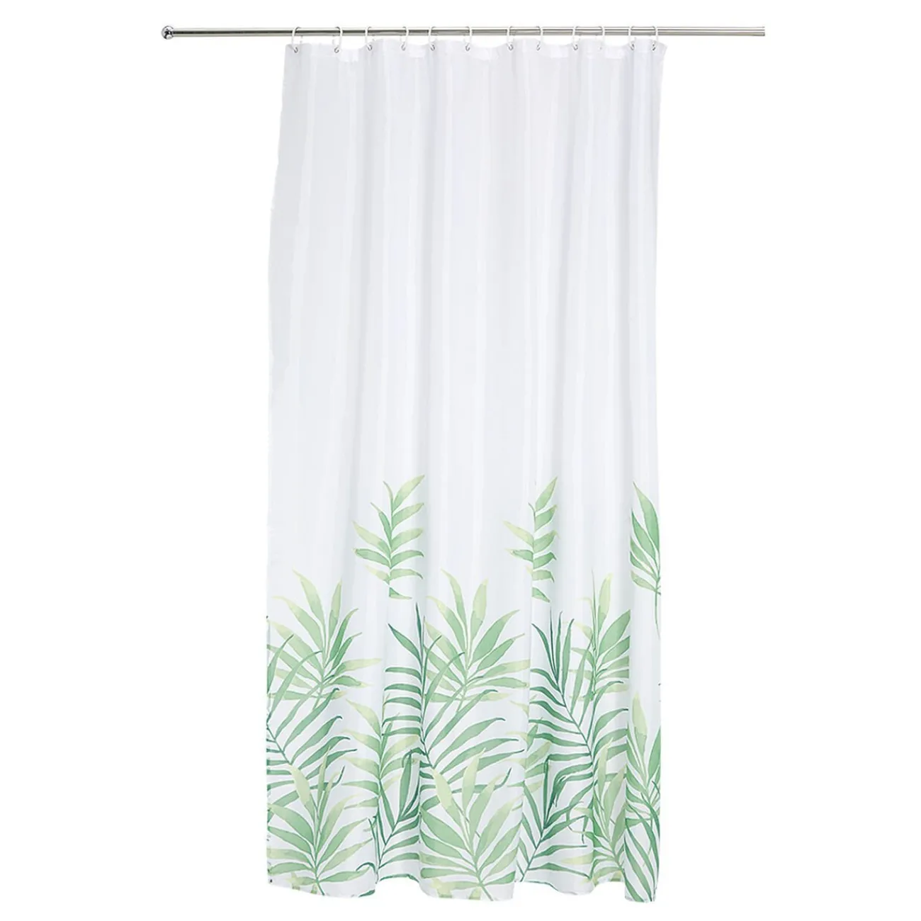 Rideau de douche Jungle de couleur blanche avec motifs feuillages verts.