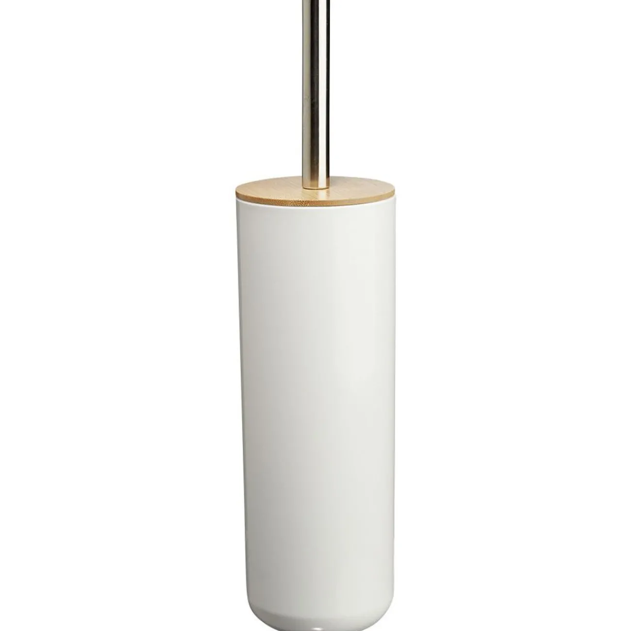 Brosse WC dans son support de forme cylindrique en plastique blanc avec couvercle déco en bambou naturel.