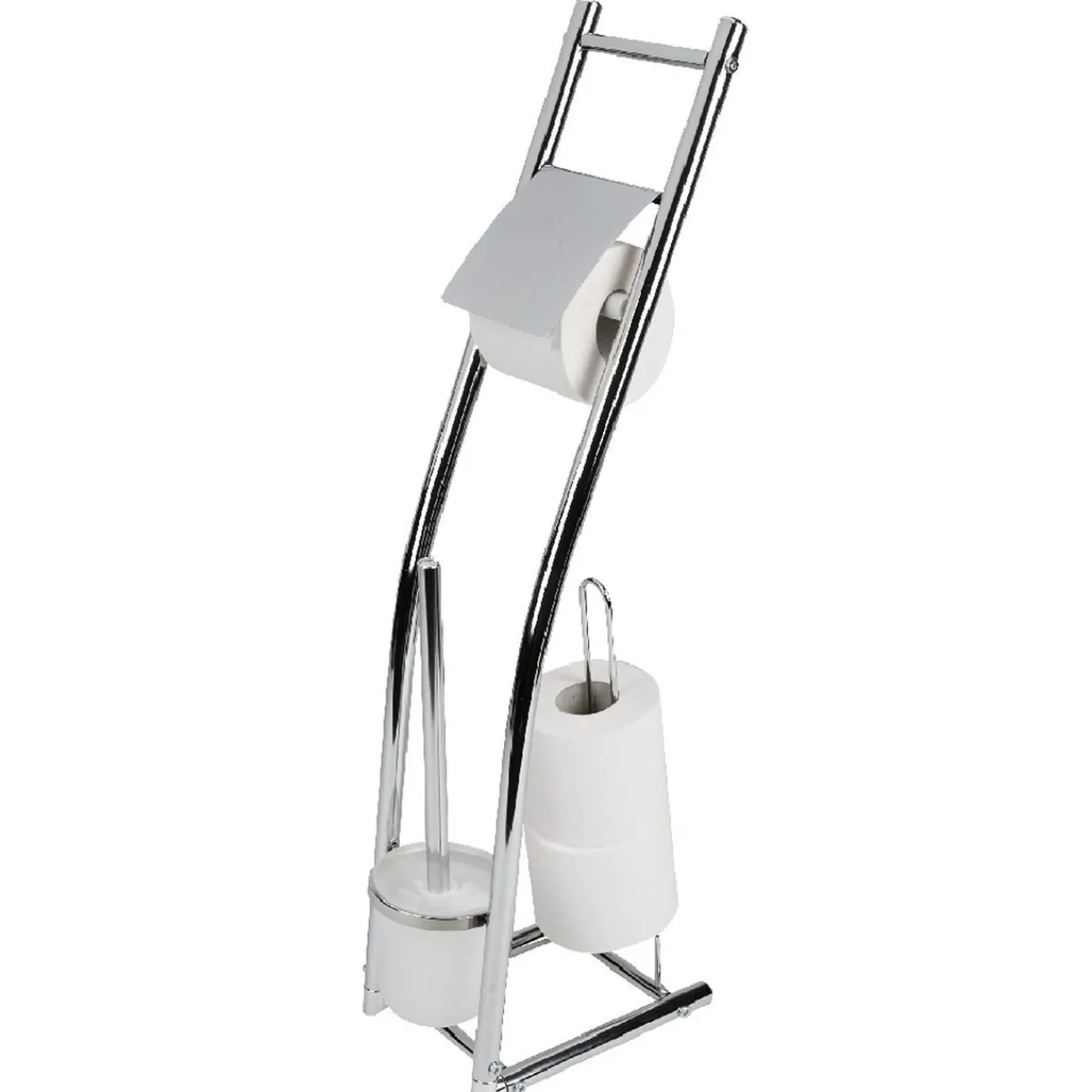 Serviteur WC en métal chromé avec brosse, support et dérouleur papier toilette.