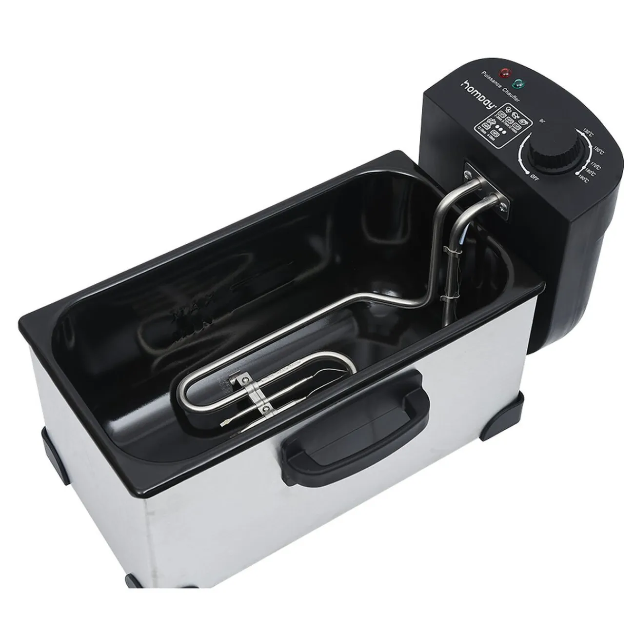 Friteuse Homday d’une contenance de 3 L, avec cuve amovible en inox et pieds antidérapants.