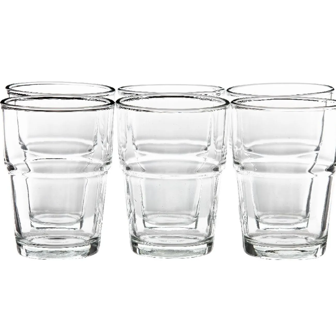 Lot de 6 verres à eau gobelet en verre transparent et empilables : un basique indémodable, peu encombrant et toujours très utile. Faible contenance particulièrement adaptée aux enfants.