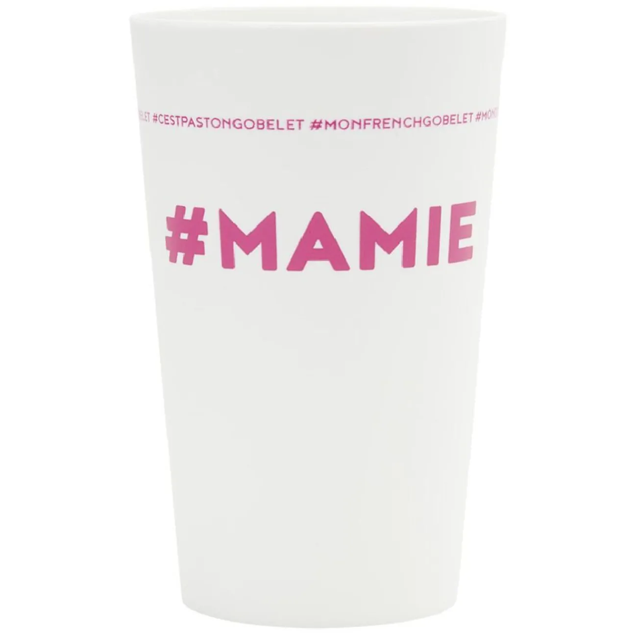 Gobelet réutilisable en plastique blanc avec inscription rose #MAMIE.