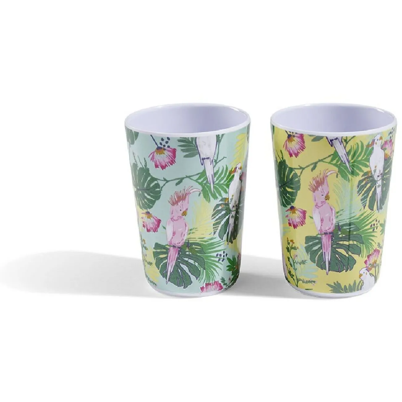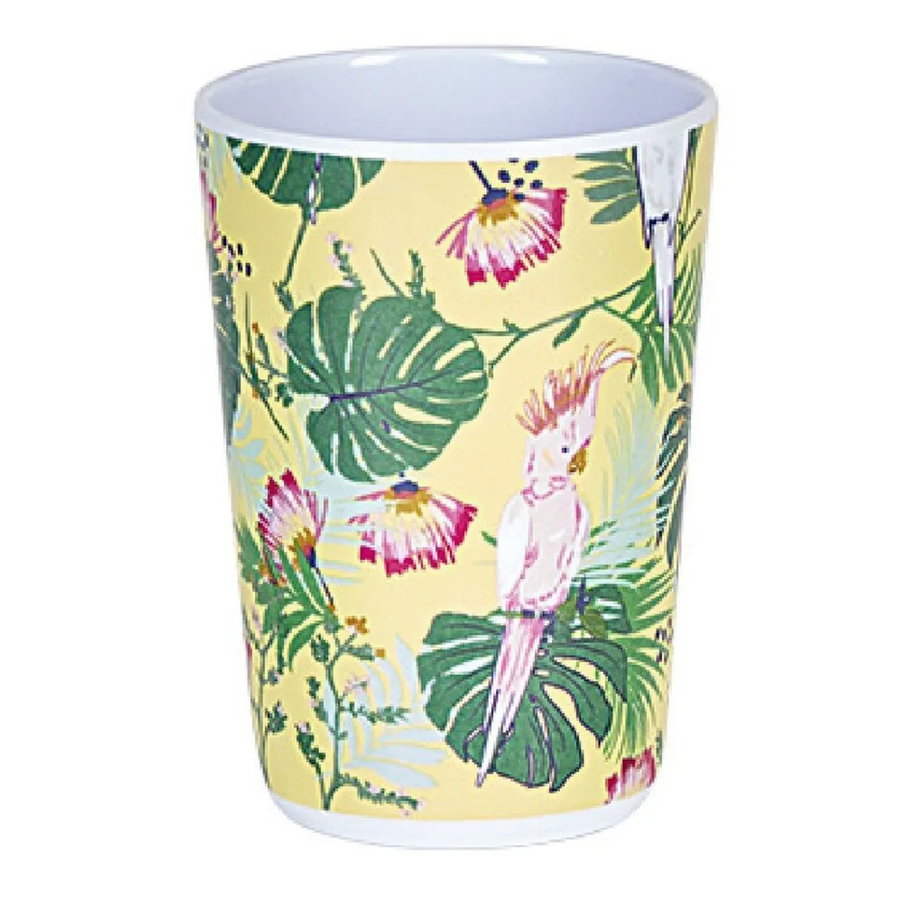 Gobelet en plastique melaminé pour une table colorée au ton tropical grâce aux motifs feuillage, fleurs et oiseaux.