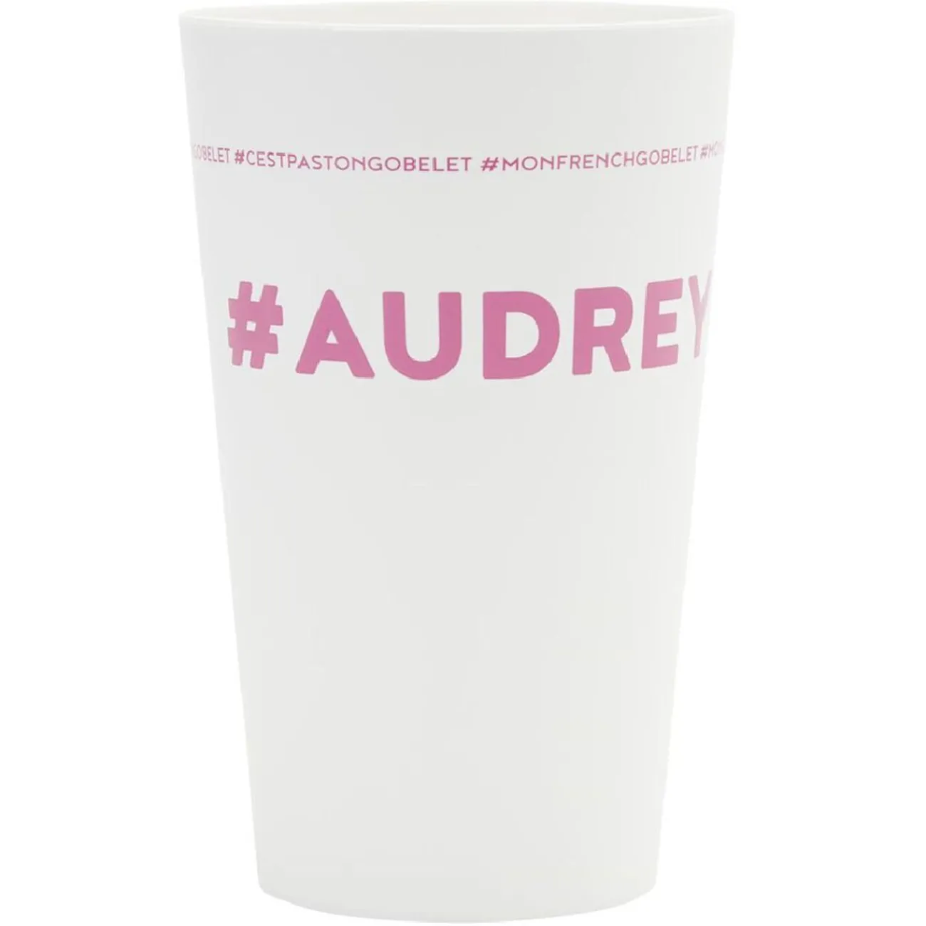 Gobelet réutilisable en plastique blanc avec inscription rose #AUDREY.