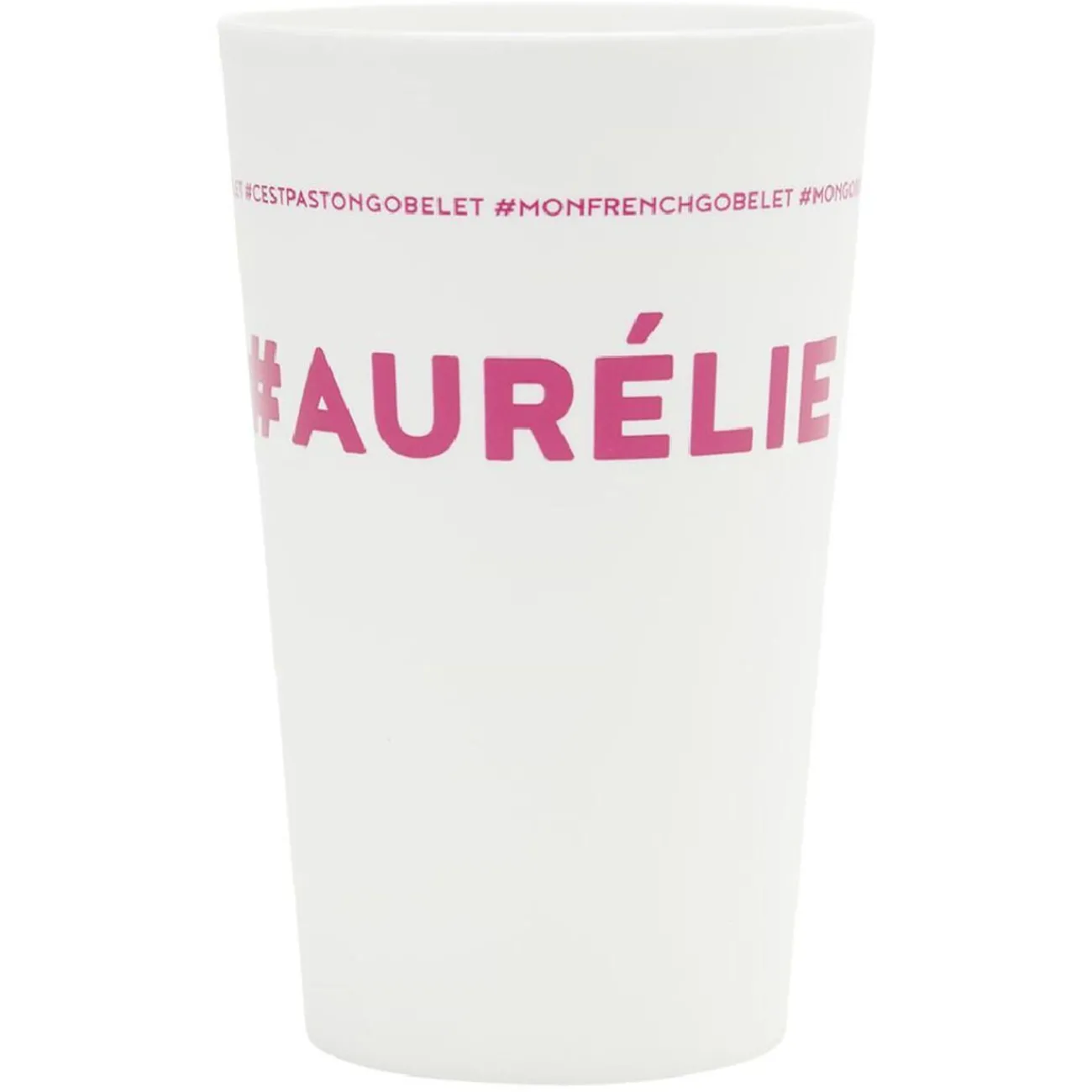 Gobelet réutilisable en plastique blanc avec inscription rose #AURÉLIE.