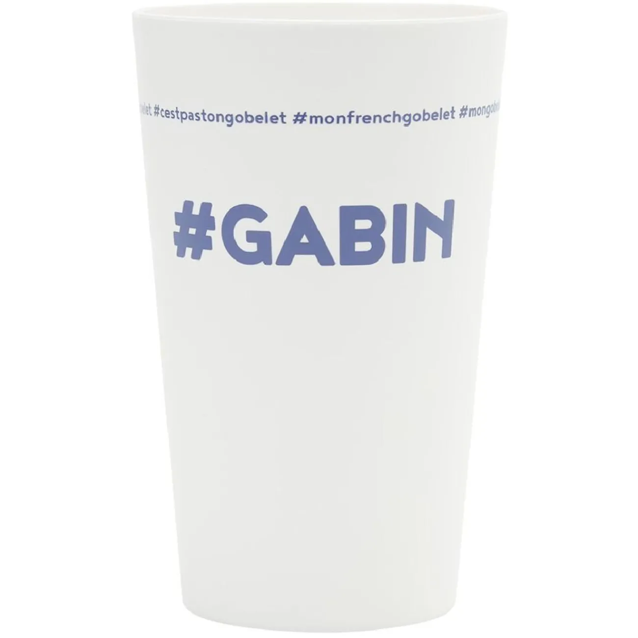 Gobelet réutilisable en plastique blanc avec inscription bleue #GABIN.